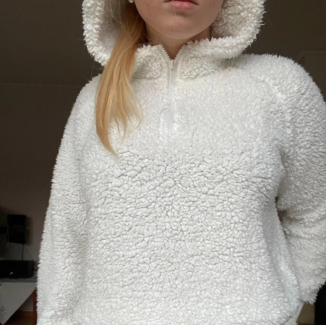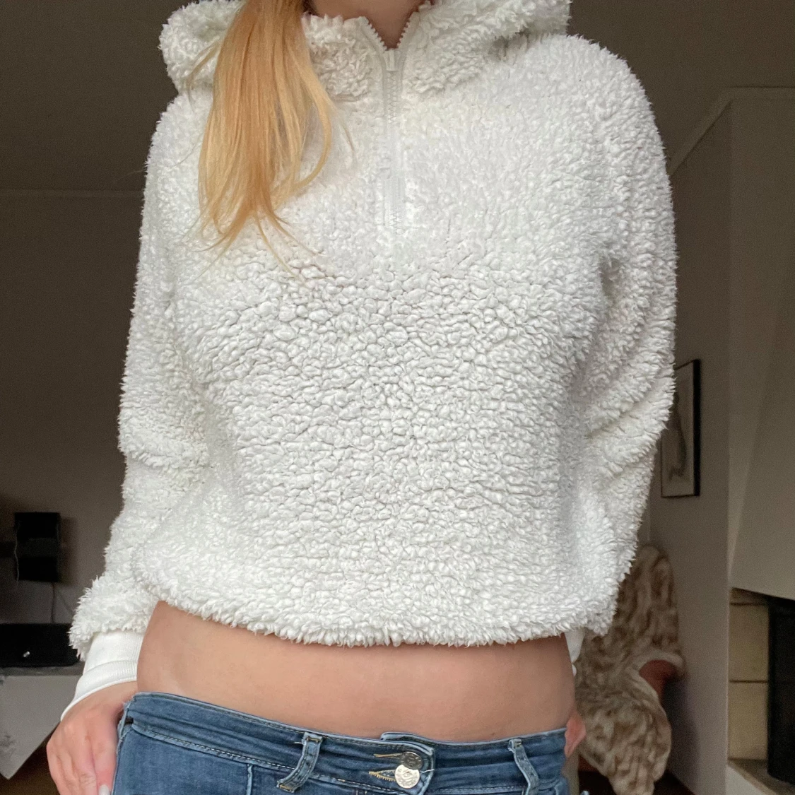 Mysig vit fleece hoodie med dragkedja och huva. Perfekt för kyliga dagar. Den har en avslappnad passform och är superbekväm att bära.