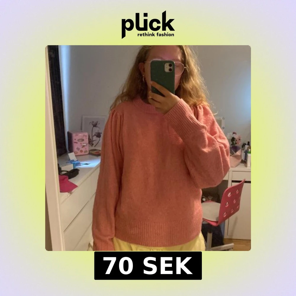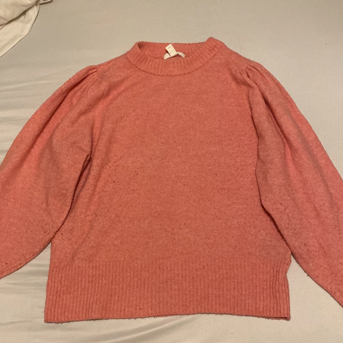 Mysig rosa stickad tröja från H&M med puffiga ärmar och bred ribbad mudd vid hals, ärmslut och nederkant. Perfekt för lager-på-lager och ger en chill men ändå söt vibe. Passar dig som gillar en lite loose fit och vill ha något färgglatt i garderoben.