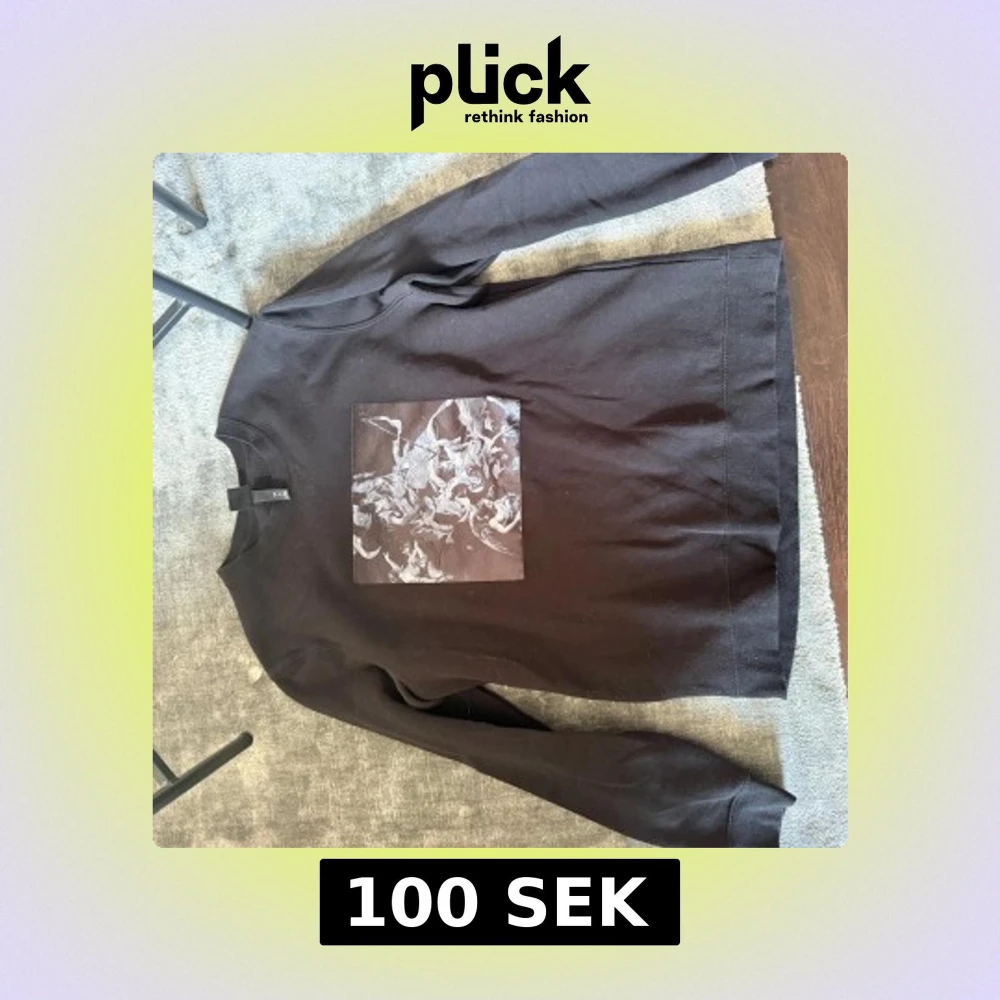Svart sweatshirt från H&M i storlek L med ett stort konstinspirerat tryck i gråskala på bröstet. Tröjan har rund halsringning och långa ärmar. Tillverkad i mjuk bomull och polyester för en skön känsla.