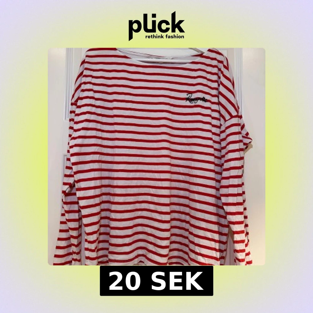 Vit tröja med röda ränder från H&M i storlek L💕 Text med ”romantic” på! Slitsen lite trasig, syns på bild!