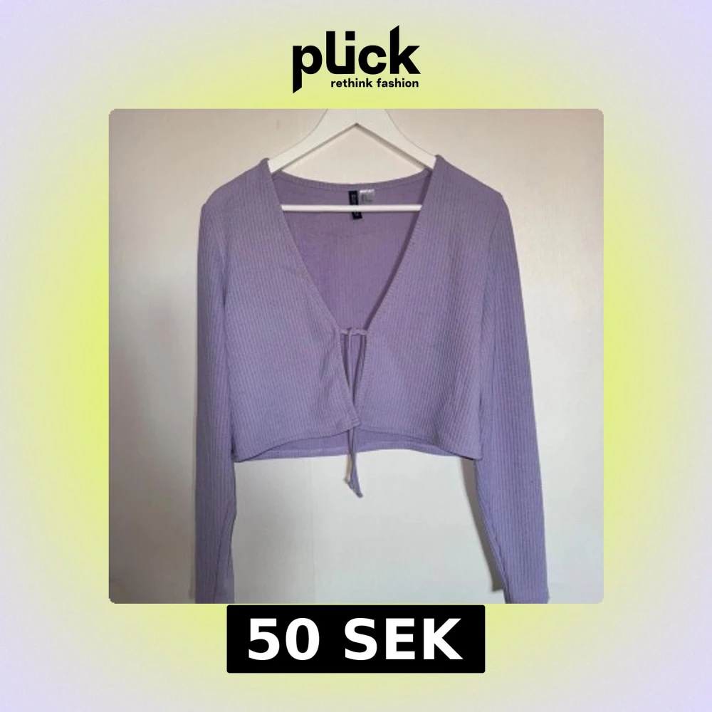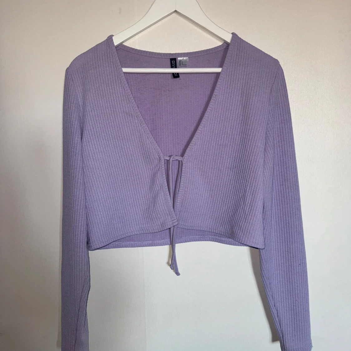 Säljer en lila ribbad kofta från H&M med knytning framtill. Koftan har en v-ringad design och långa ärmar, perfekt för lager-på-lager stil. Passar utmärkt till både jeans och kjol. 💜