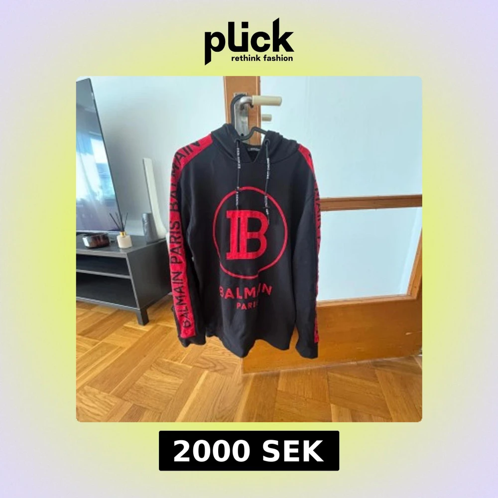 Svart hoodie från Balmain med röda detaljer och stor logga på bröstet och på ärmarna. Tröjan har huva med snörning, långa ärmar och dragkedjor vid ärmsluten. Storlek L men passar M (HELT NYTT SKICK)