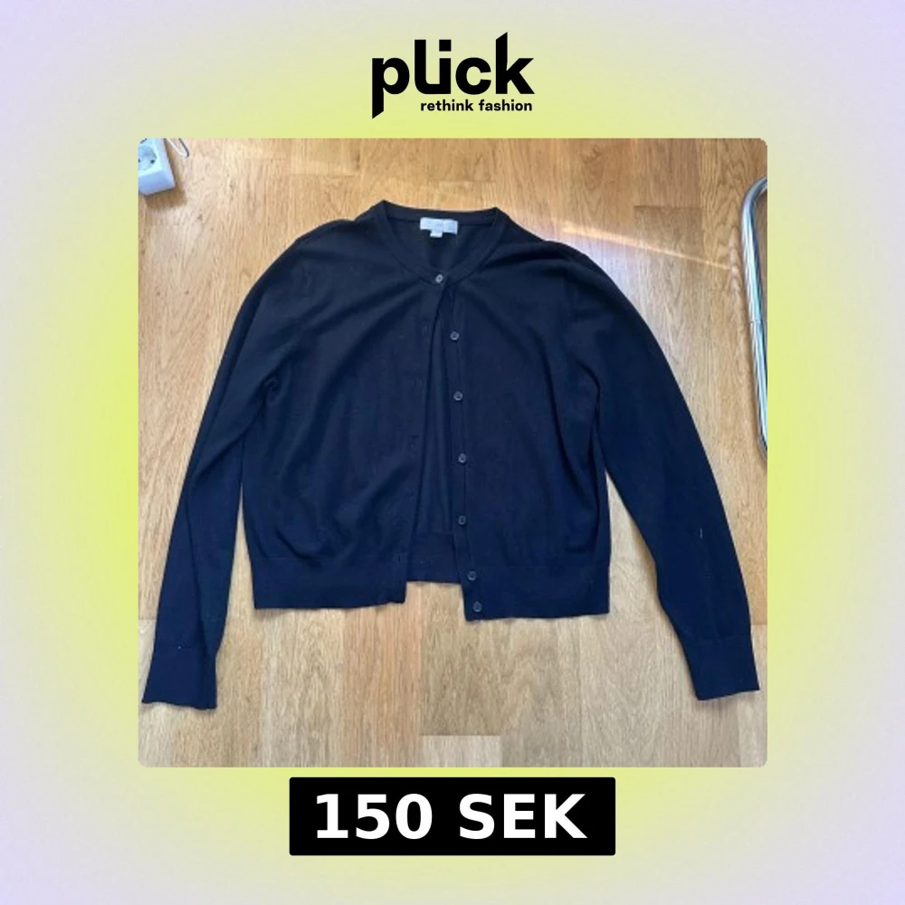 Svart klassisk kofta från H&M i storlek L. Den har rund hals, långa ärmar och knappar framtill. Materialet är mjuk bomull som känns skönt mot huden. Perfekt att slänga över en t-shirt eller linne.