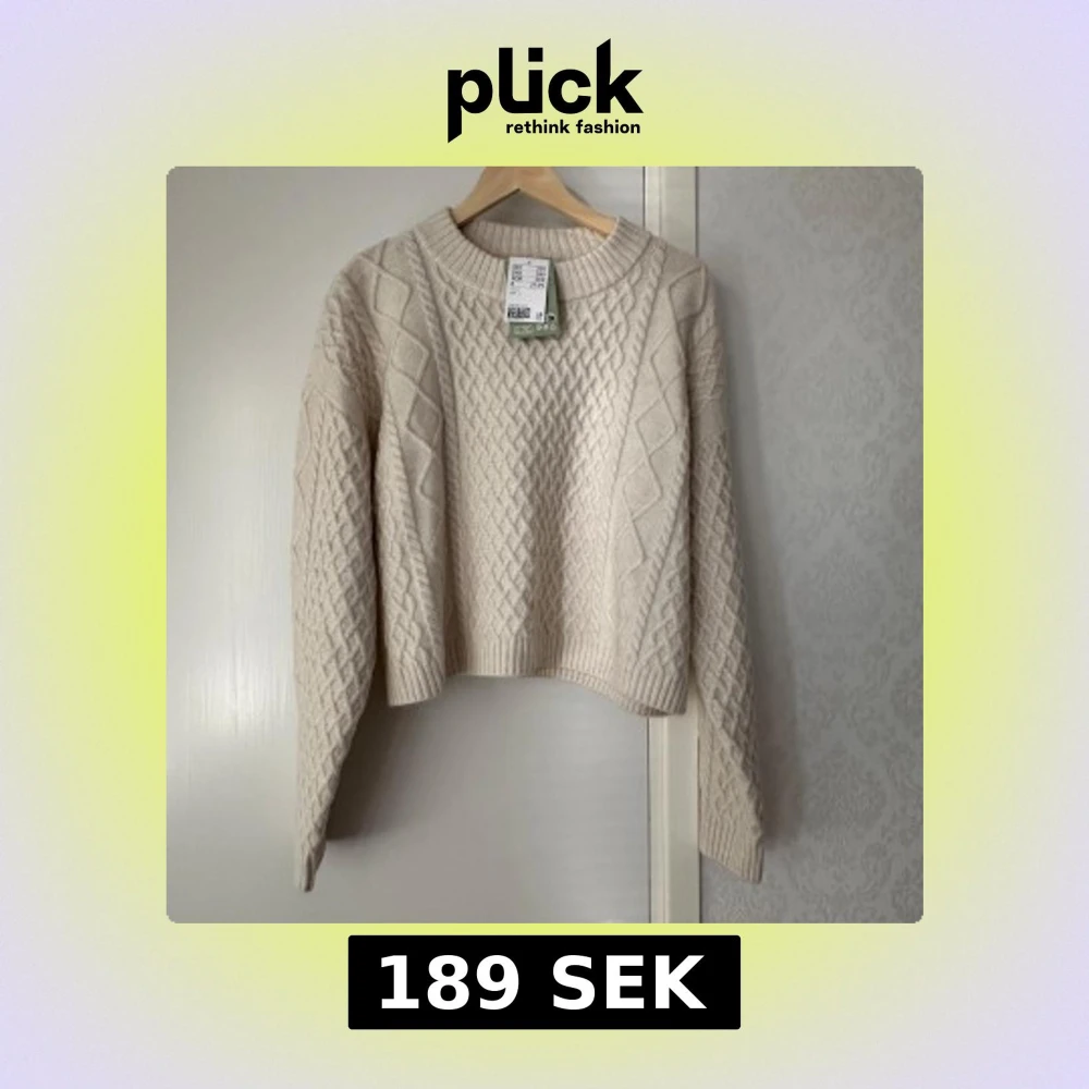 Supermysig beige stickad tröja med grovt flätmönster framtill och på ärmarna. Tröjan har rund halsringning, ribbade muddar och en något boxig, croppad passform. Perfekt för lager-på-lager under kyliga dagar.