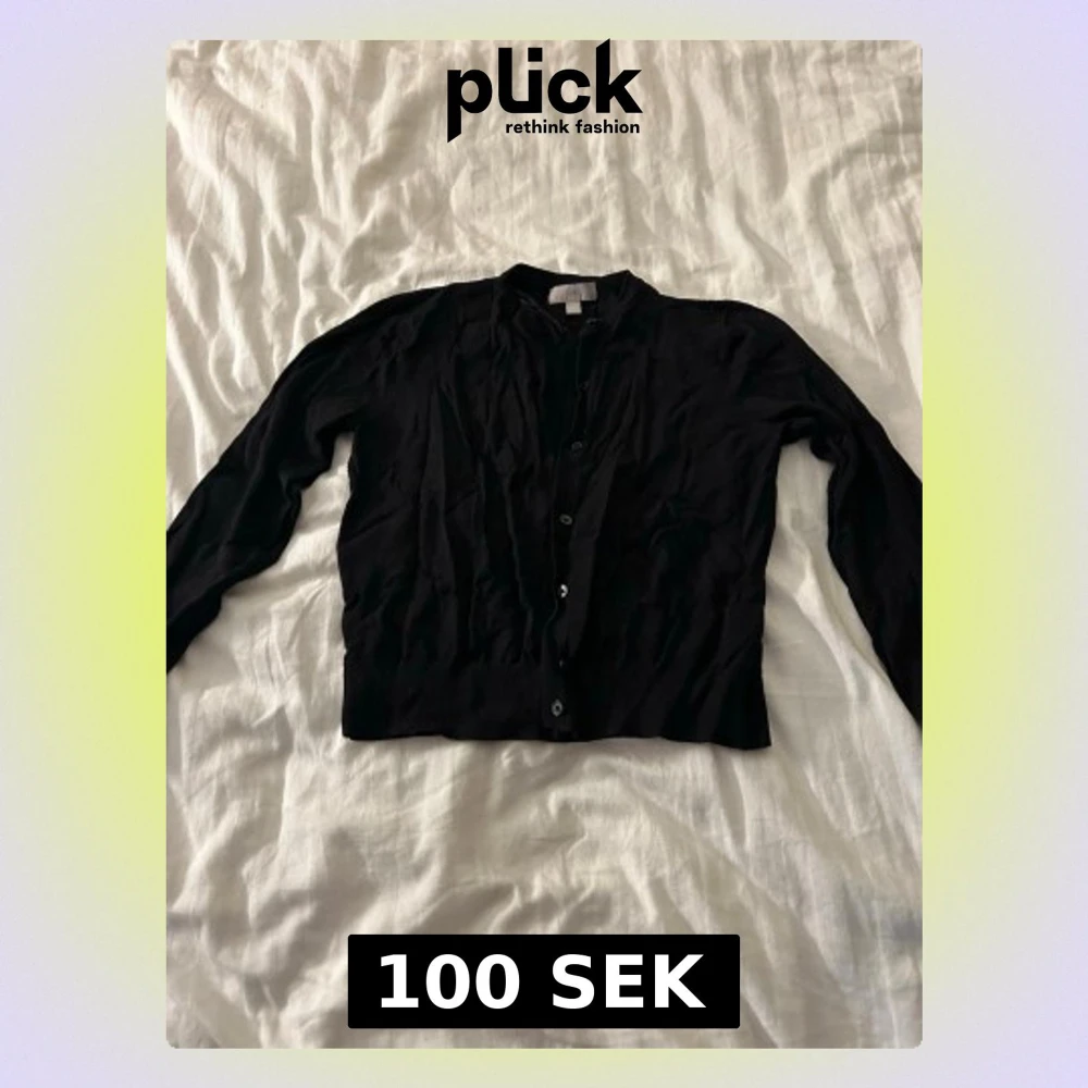 Klassisk svart kofta från H&M med rund halsringning och knäppning framtill. Tillverkad i ett mjukt och tunt material som passar perfekt för lager på lager. Långa ärmar och ribbade muddar vid ärmslut och nederkant.