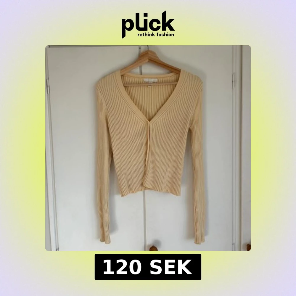 Snygg ljusgul/beige kofta från H&M i ribbad stickad bomull. Modellen har v-ringning, långa ärmar och knappar framtill. Har en liten fläck på ena armbågen, men i övrigt i bra skick. Jag har vanligtvis S/M💕💕