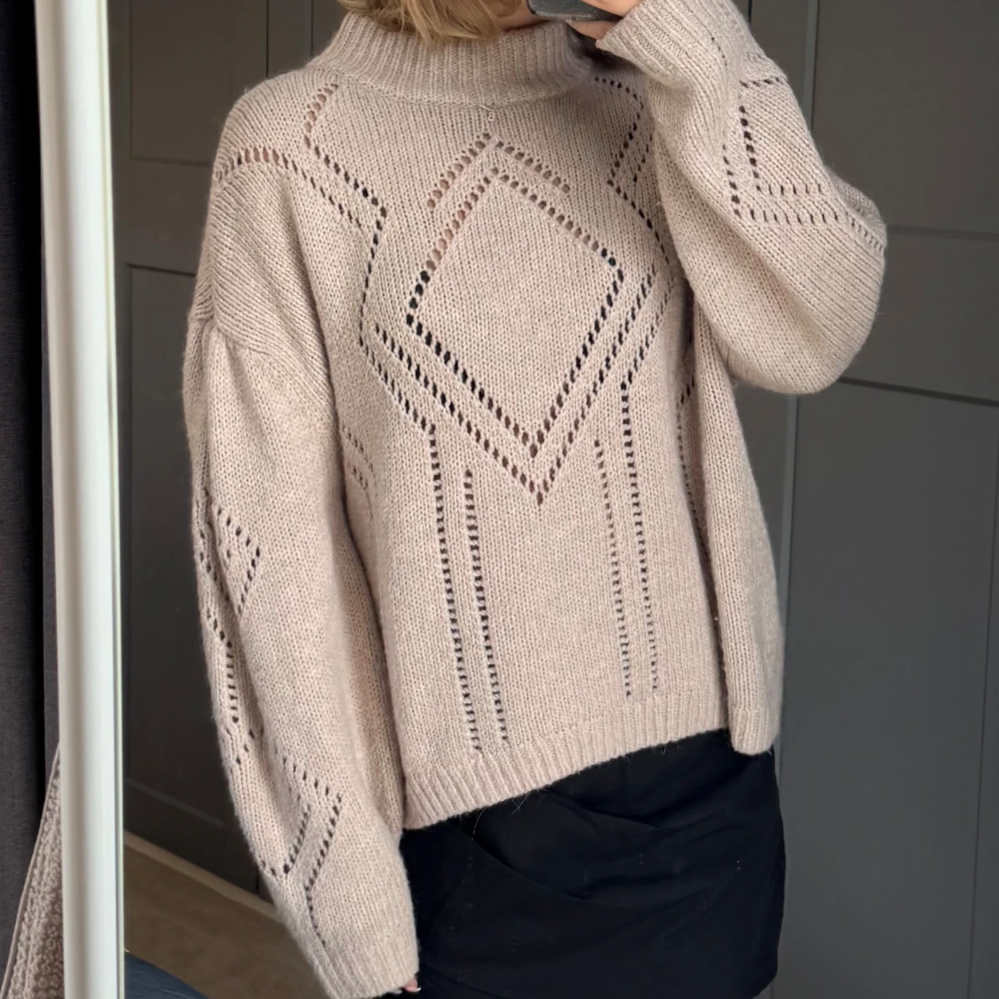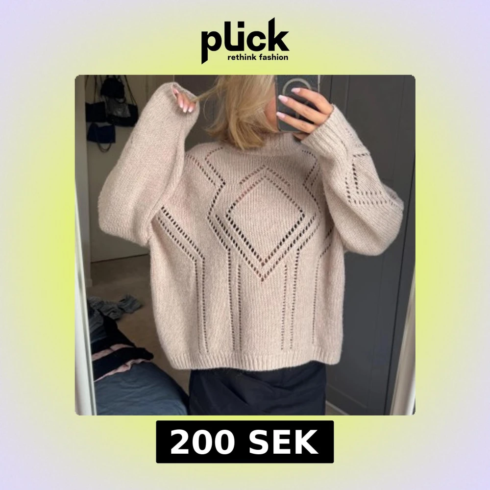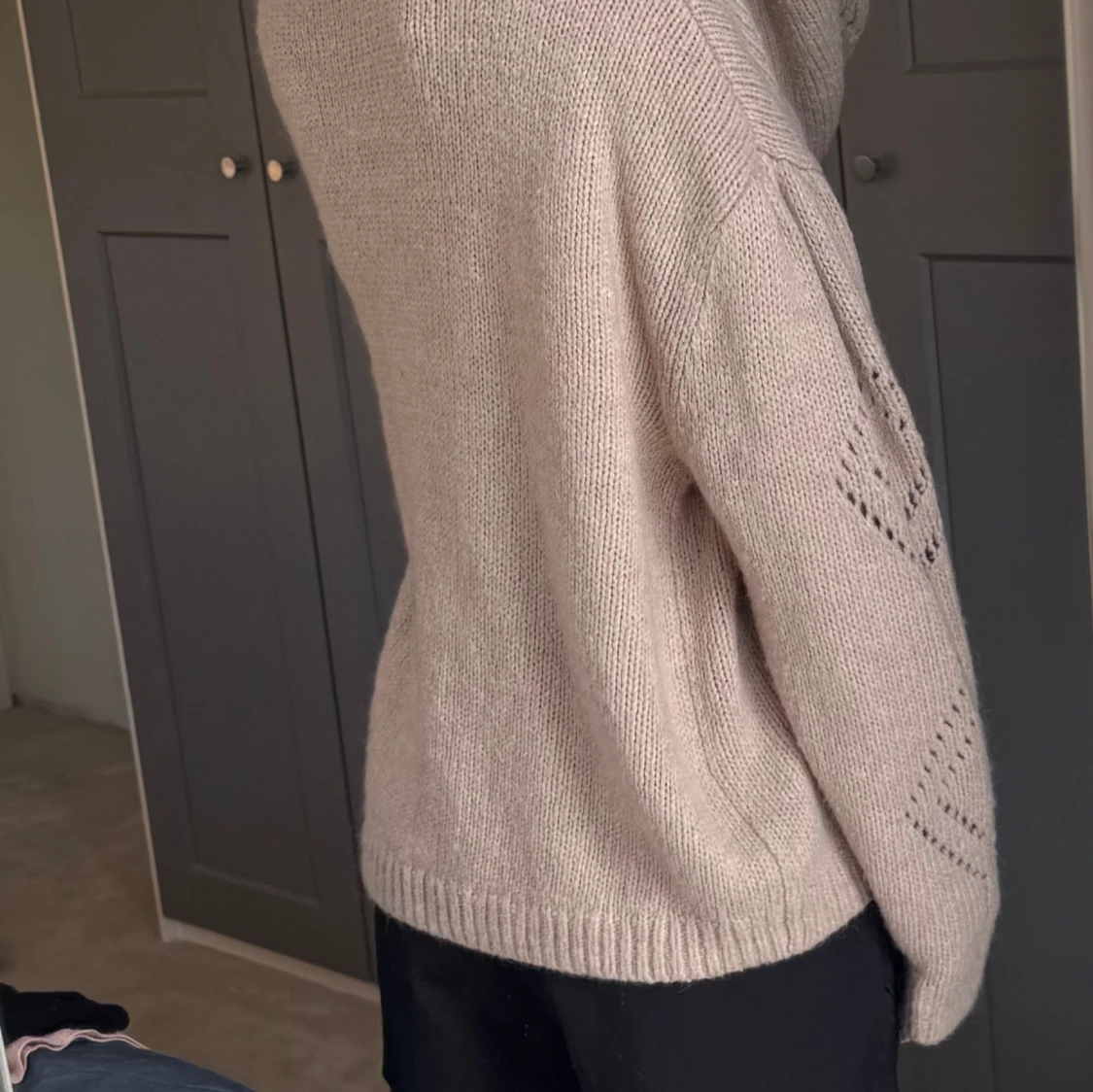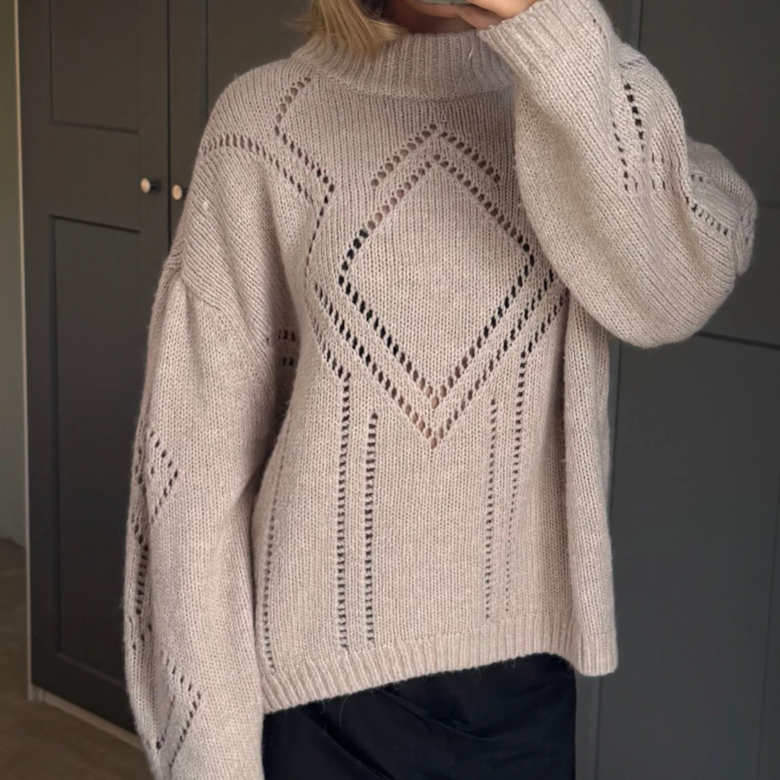 Säljer en beige stickad tröja med snygga hålmönster i geometriska former. Tröjan har en loose passform, långärmade ärmar och hög hals.