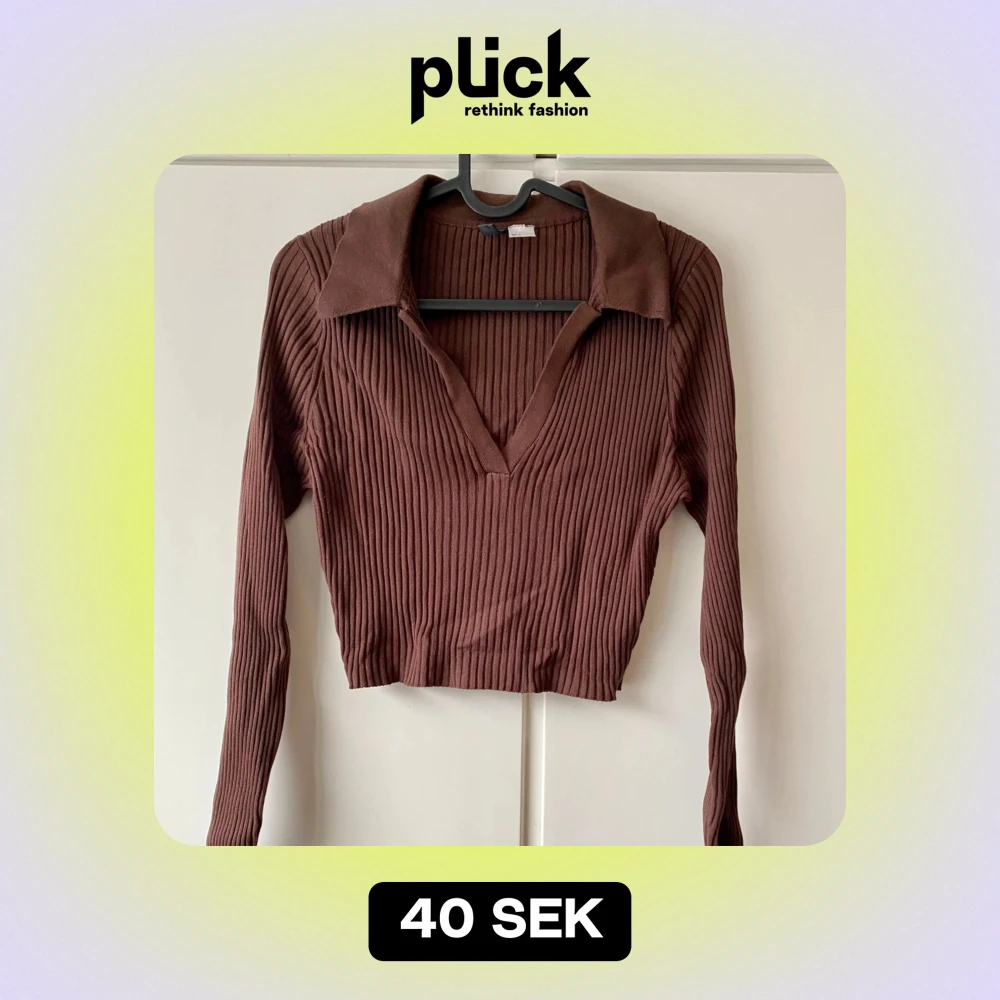 Säljer en snygg brun ribbad tröja med krage och v-ringning. Den är croppad och har långa ärmar. Tröjan är i bra skick och passar både till vardags och fest.