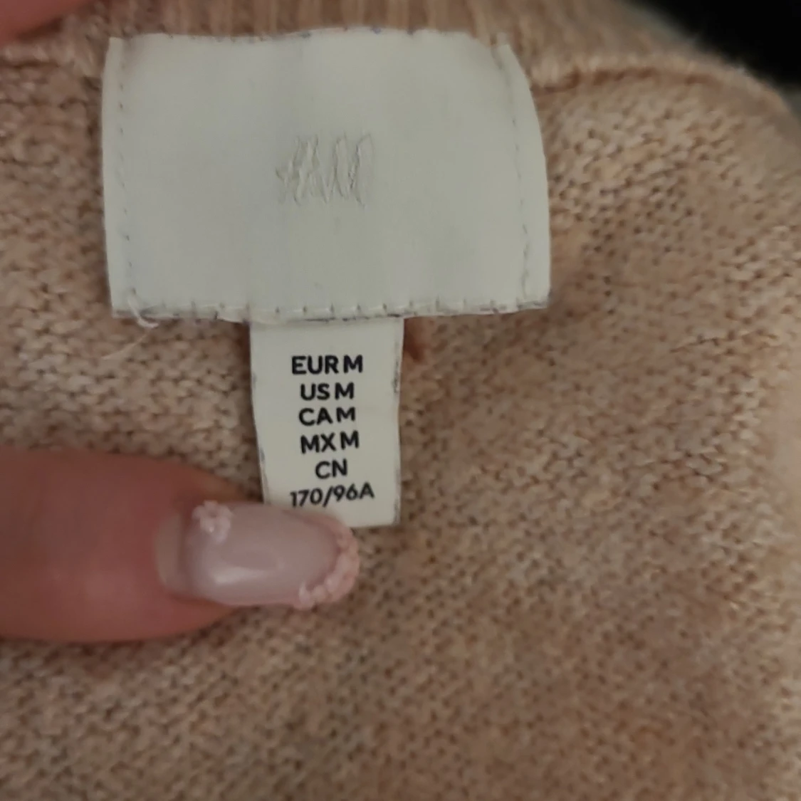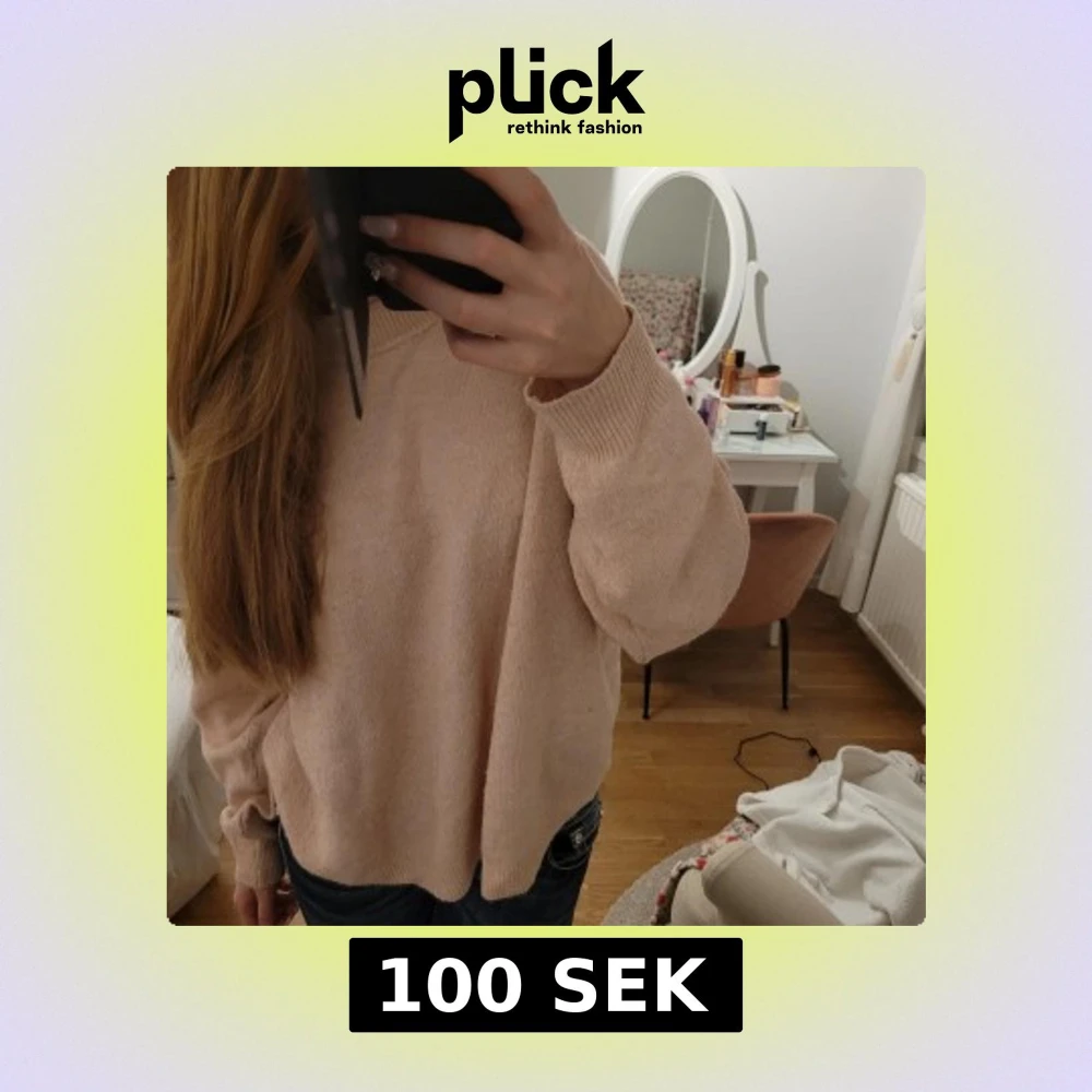 Säljer en mysig rosa stickad tröja från H&M. Tröjan har en avslappnad passform med långa ärmar och ribbade muddar. Perfekt för kyligare dagar.