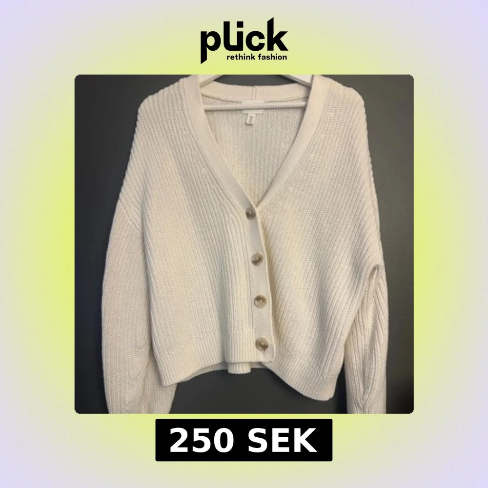 Mysig vit stickad kofta från H&M med v-ringning och stora knappar framtill. Koftan har en loose passform, ribbade muddar och långa ärmar. Perfekt att slänga på sig under kyliga dagar.