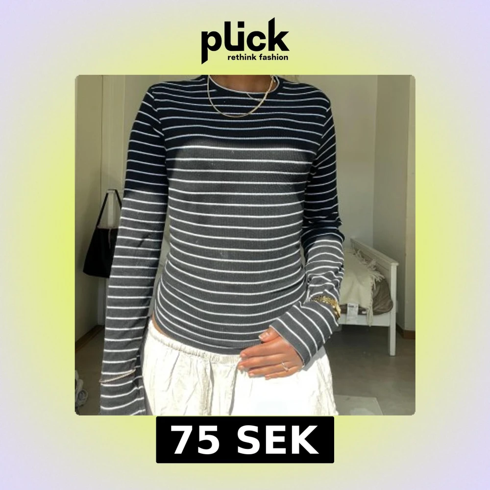 Slimmad svart långärmad tröja med vita horisontella ränder. Tröjan har rund hals och är gjord i ett mjukt, ribbat bomullsmaterial som sitter snyggt mot kroppen. Perfekt att styla med jeans eller kjol för en clean och chill look.
