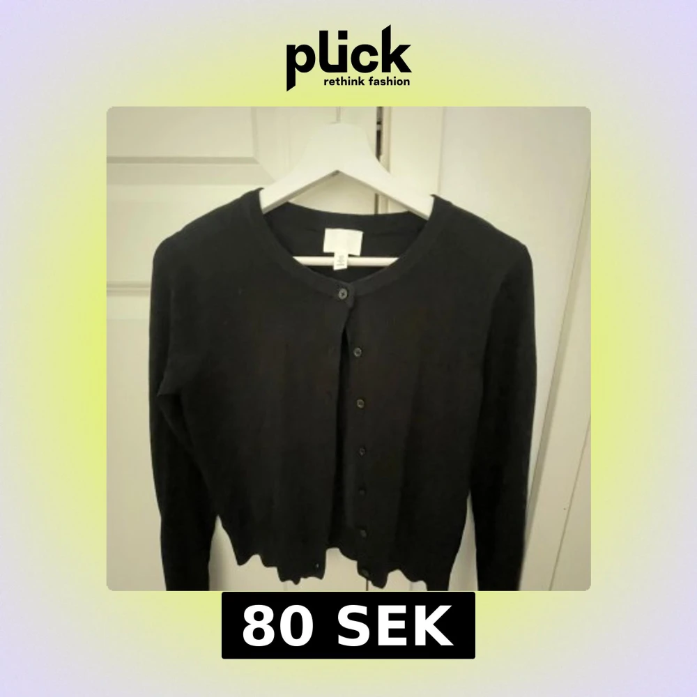 En svart kofta från H&M med rund halsringning och knäppning framtill. Koftan har långa ärmar och en något croppad passform med vågig nederkant. Perfekt att slänga över en topp för en enkel och stilren look.