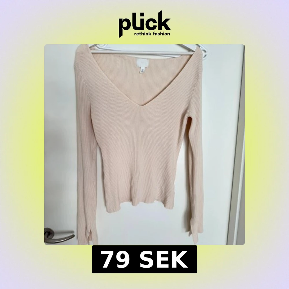 Säljer en stilren beige ribbad tröja från H&M med v-ringning och långa ärmar. Perfekt för en chic och enkel look. Tröjan har en mjuk och bekväm passform.