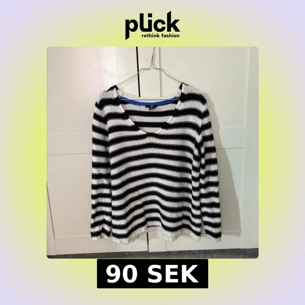 Säljer en svartvit randig tröja från H&M. Tröjan har en v-ringad hals och långa ärmar, perfekt för en avslappnad stil. Den är tillverkad i ett mjukt material som känns skönt mot huden.