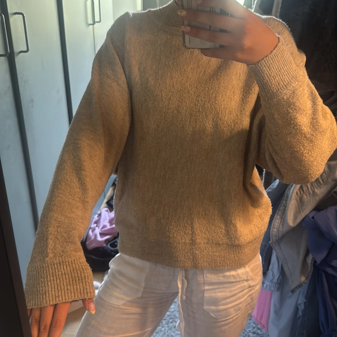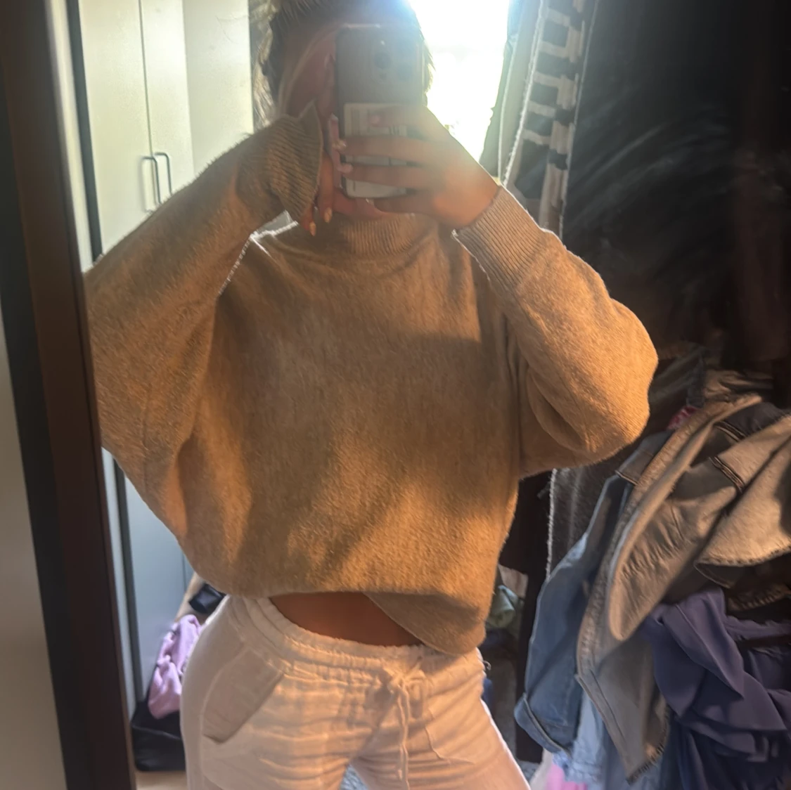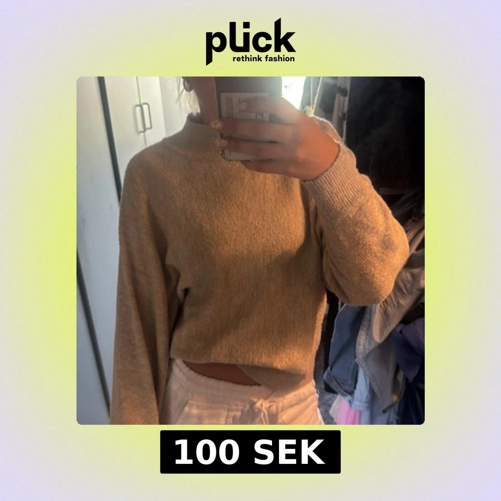 Mysig beige stickad tröja med hög krage och långa ärmar. Tröjan har en loose passform och breda ribbade muddar vid ärmslut och nederkant. Perfekt för lager-på-lager och chill dagar.