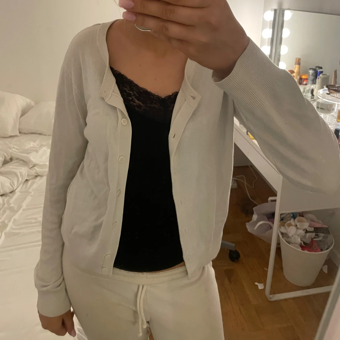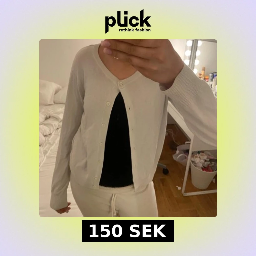 Säljer en stilren vit kofta med rund halsringning och knäppning framtill. Koftan har långa ärmar och är tillverkad i ett mjukt, tunt material som känns skönt mot huden. Perfekt att slänga över ett linne eller t-shirt för en clean look.