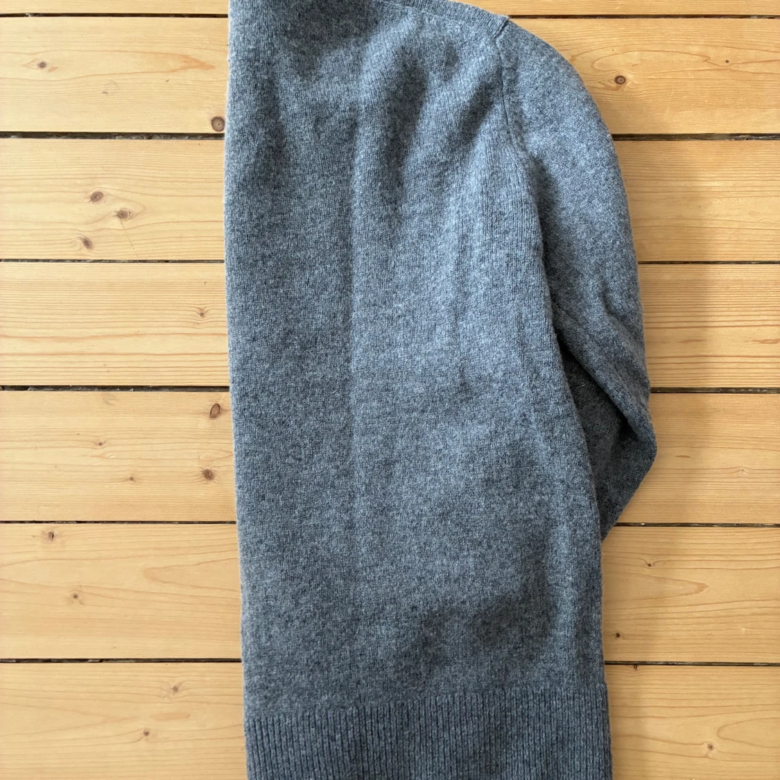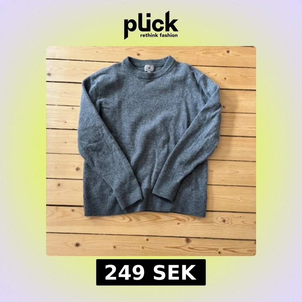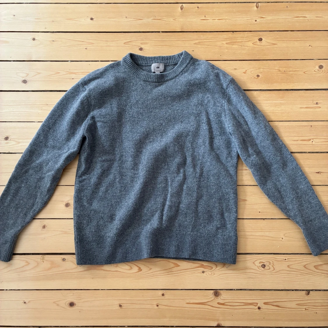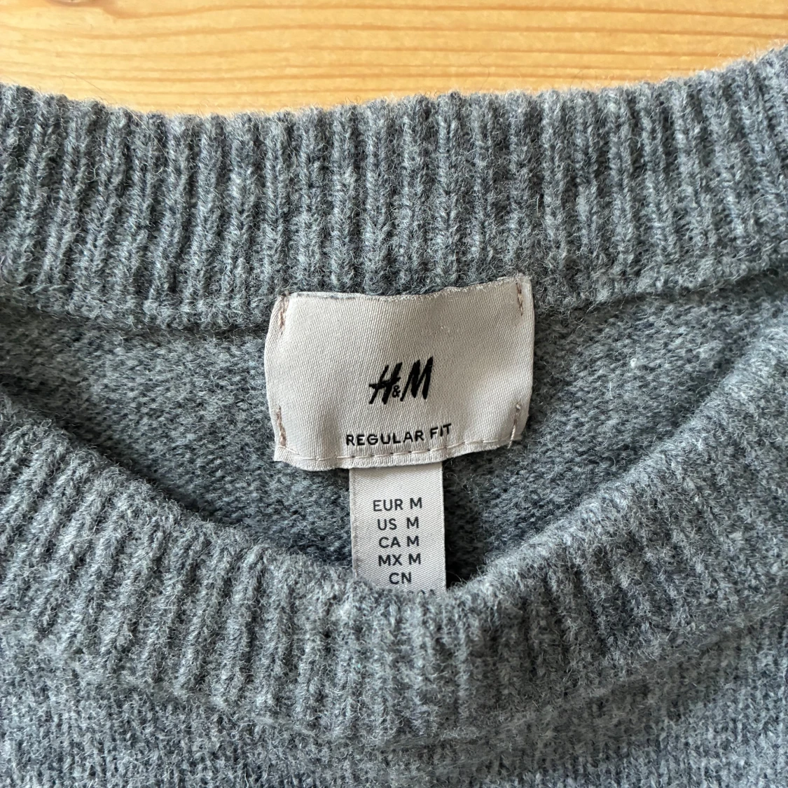 Säljer en stilren grå stickad tröja från H&M i regular fit. Tröjan har långa ärmar och ribbade muddar vid ärmslut och nederkant. Perfekt för kyligare dagar!