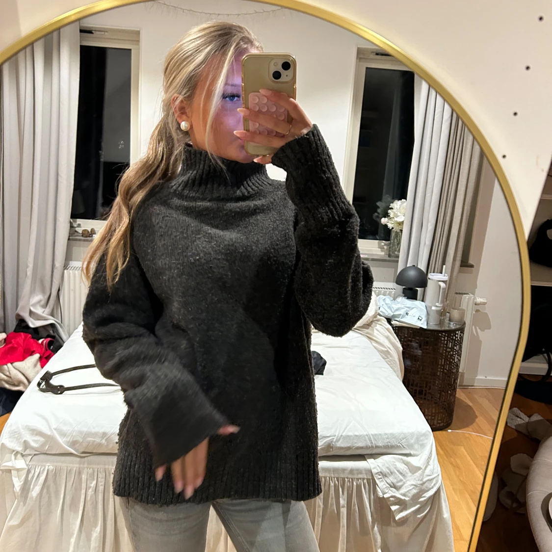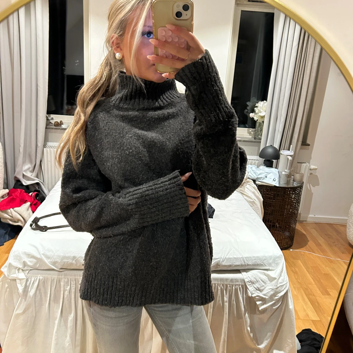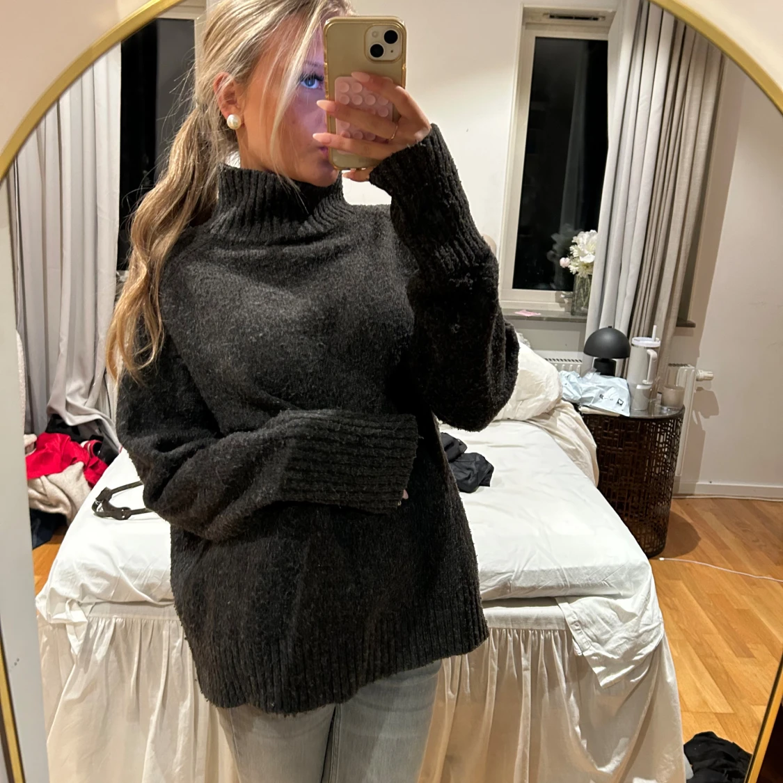 Mysig mörkgrå stickad polotröja med oversized passform och långa ärmar. Tröjan har bred ribbstickad mudd vid ärmslut, nederkant och hals. Perfekt för kalla dagar och enkel att styla med jeans eller kjol.