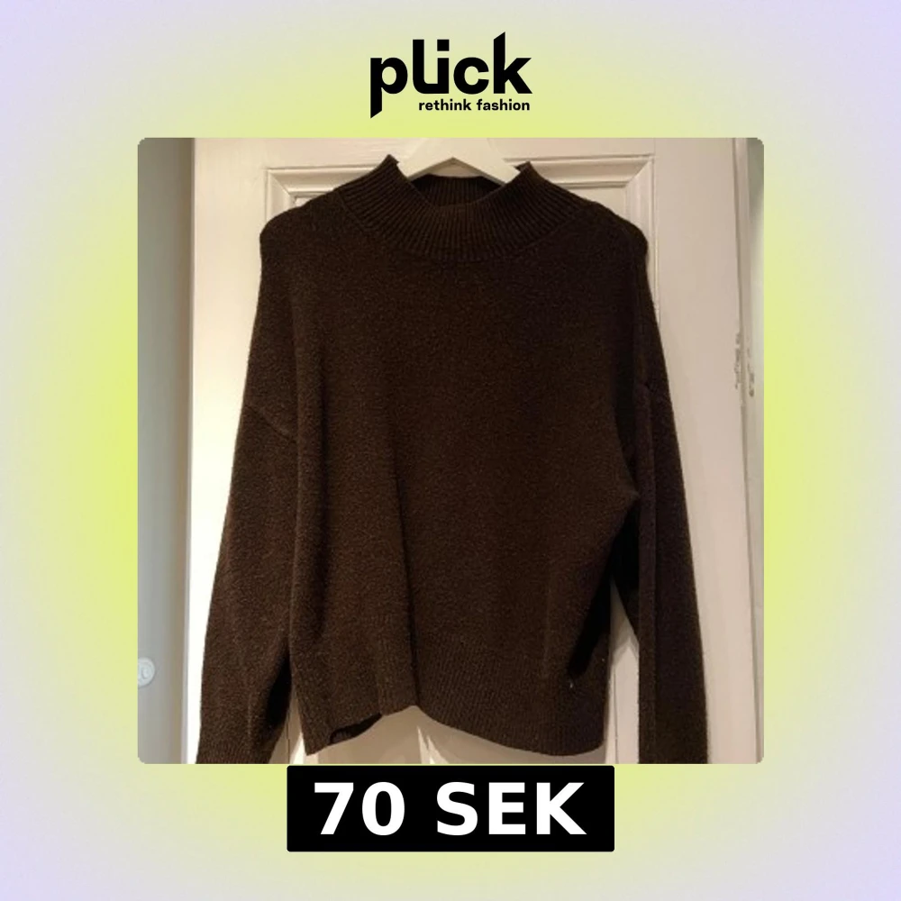 Mysig brun stickad tröja med ribbad krage och långa ärmar. Perfekt för kyliga dagar och enkel att matcha med olika outfits.