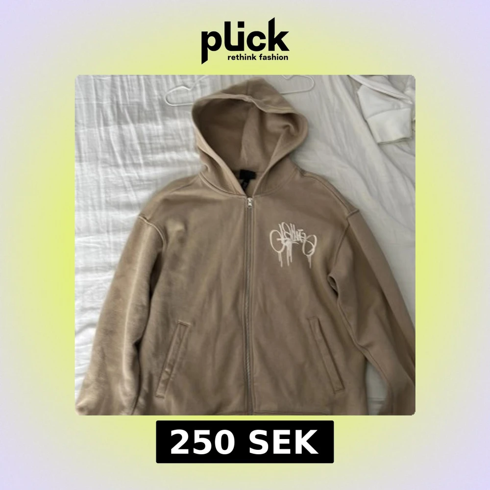 Beige hoodie från H&M med dragkedja och huva. Framtill finns ett vitt graffiti-tryck och på ryggen ett stort tryck med texten 'Brooklyn' i grönt och svart samt ett foto. Modellen är relaxed fit och har fickor på sidorna.