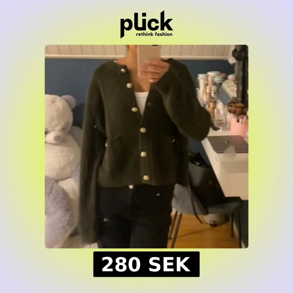 Säljer en mörkgrön, croppad kofta med stora guldknappar och två fickor framtill. Koftan är stickad och har långa ärmar, perfekt för lager-på-lager och chill vibes. Snygg att styla med både jeans och kjol.