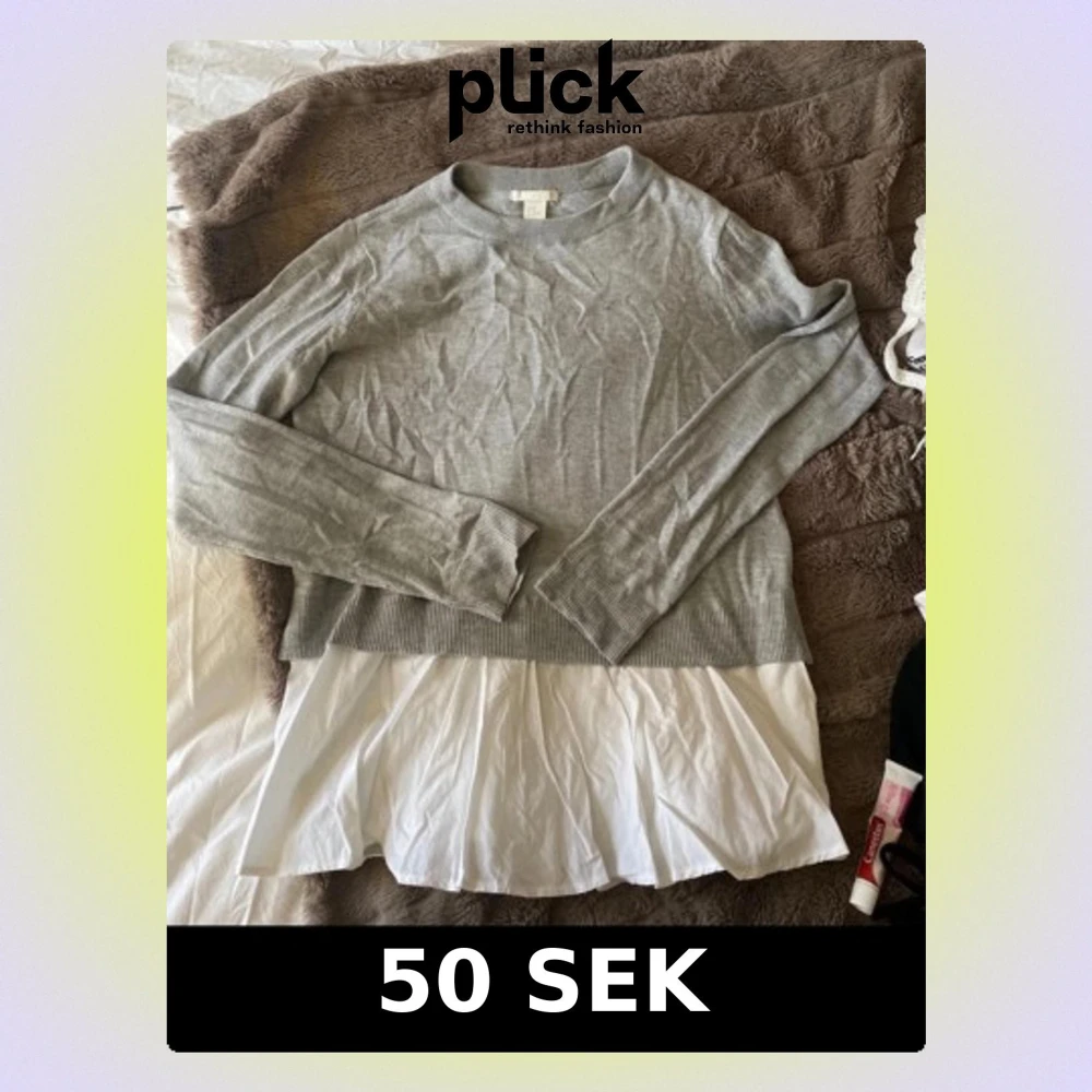 Snygg grå tröja från H&M i storlek M med vit skjortdetalj nedtill. Tröjan har rund halsringning, långa ärmar och ribbade muddar. Perfekt för en lager-på-lager-look och enkel att styla till jeans eller kjol.
