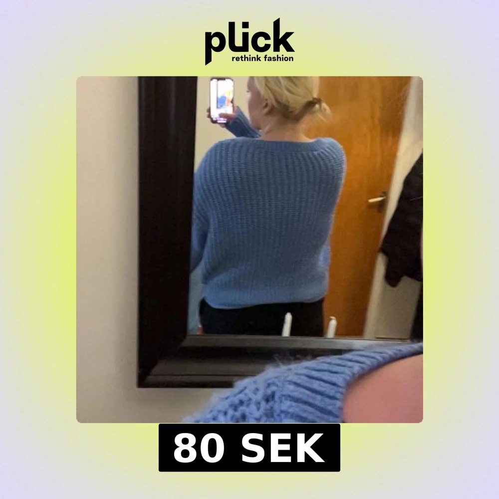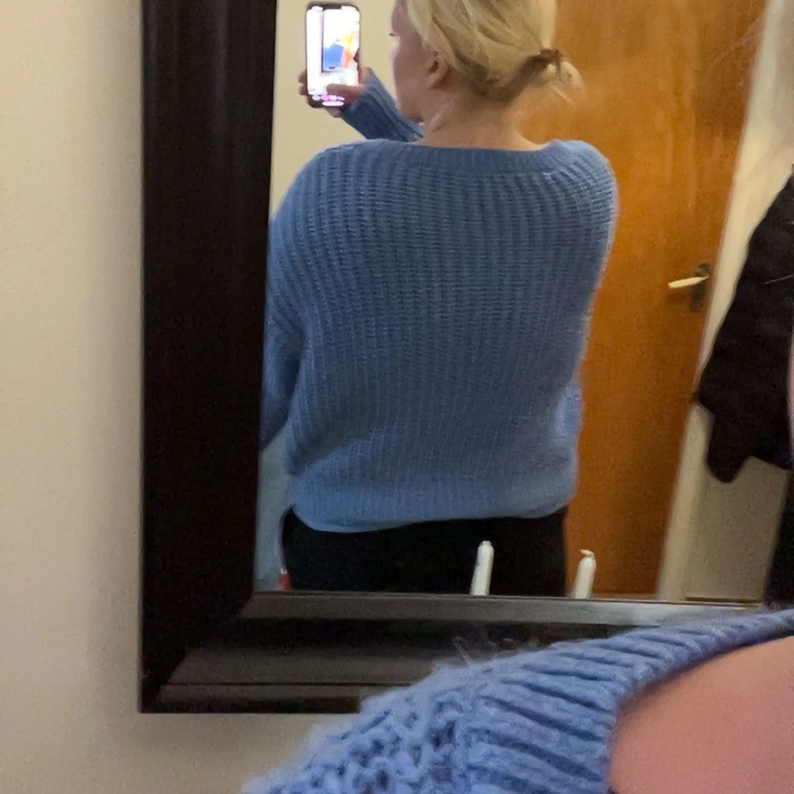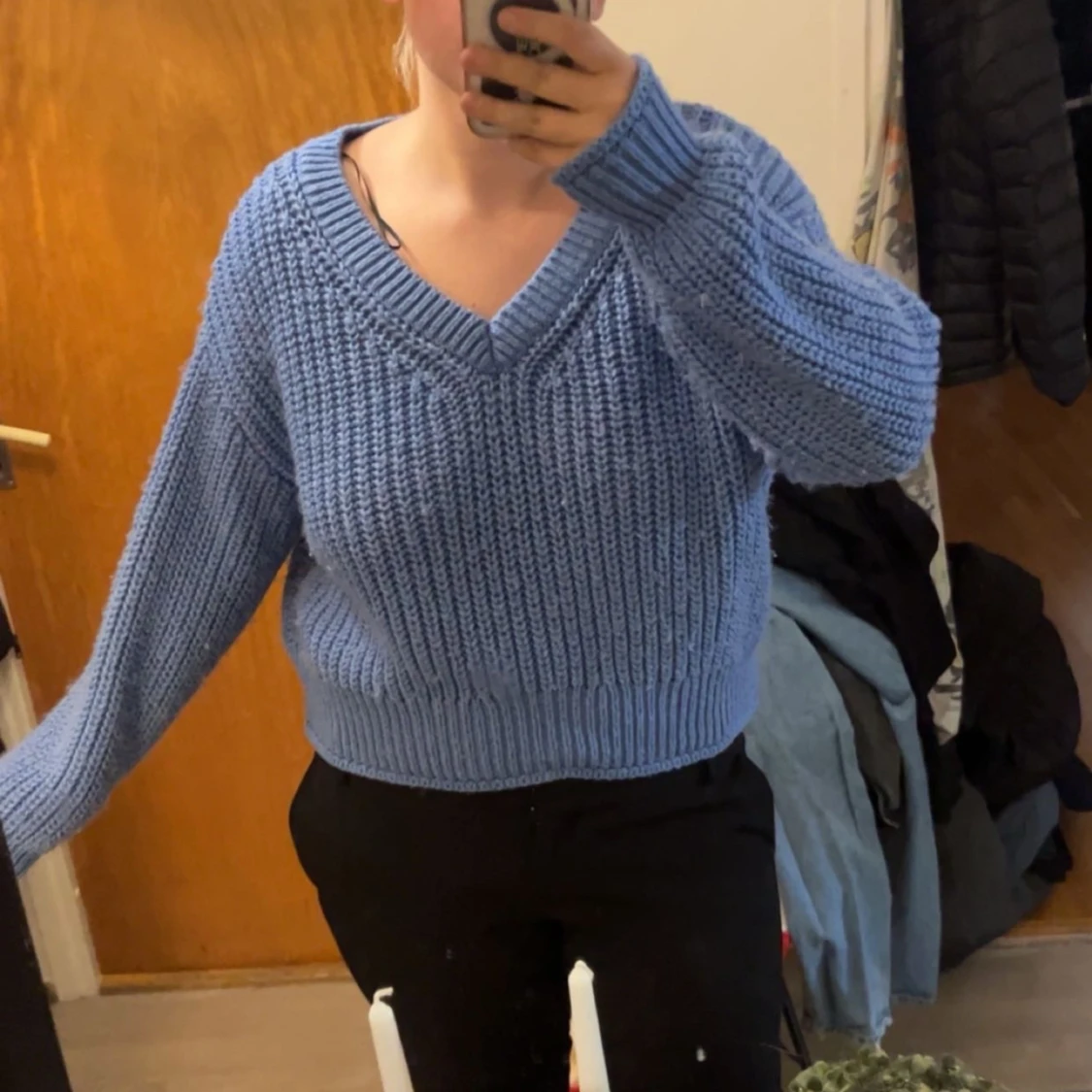 Mysig blå stickad tröja med v-ringning och lång ärm. Tröjan har en loose passform och är perfekt för kyligare dagar. Den ribbade strukturen ger en snygg och avslappnad look.