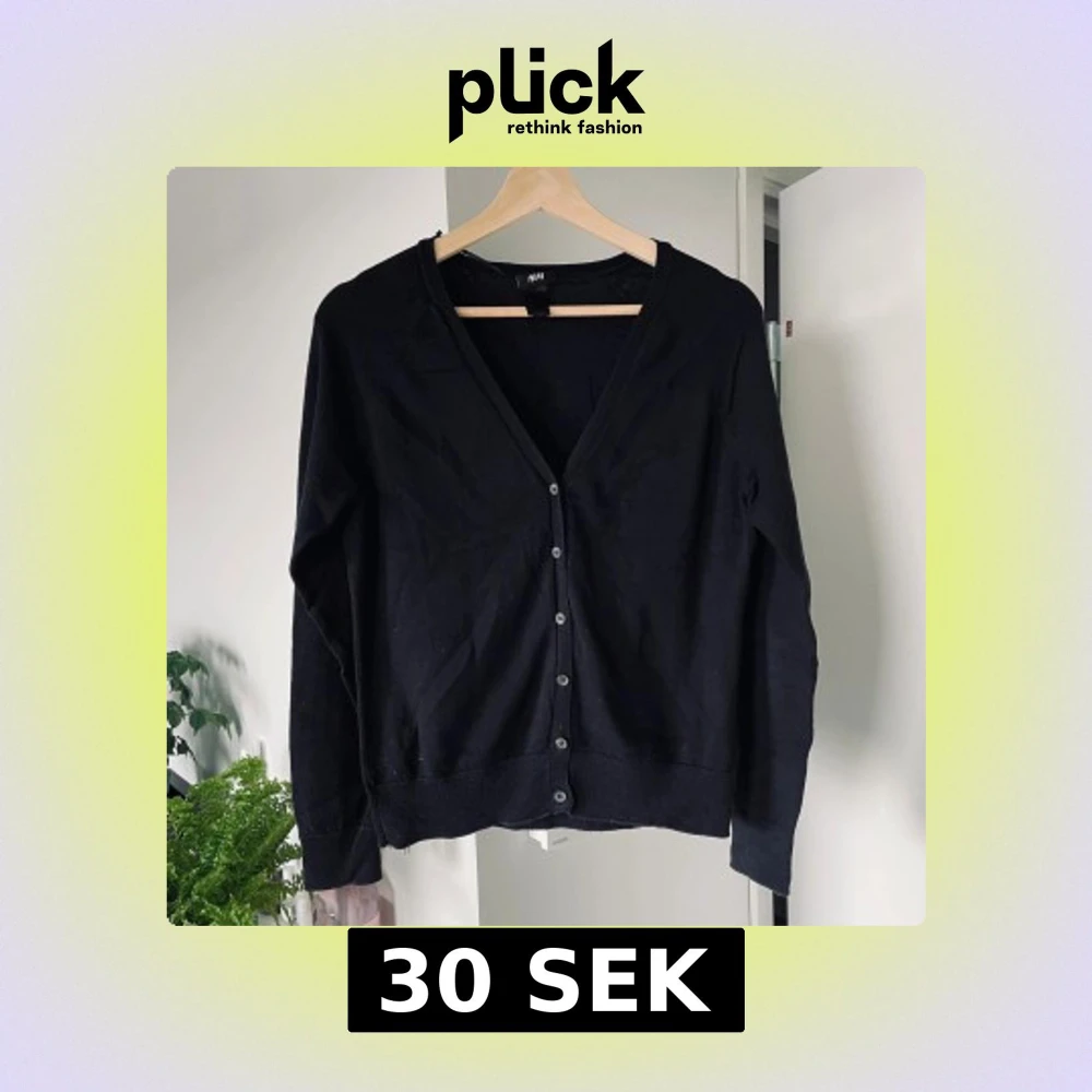 En klassisk svart kofta från H&M med v-ringning och knäppning framtill. Långärmad modell med ribbade muddar vid ärmslut och nederkant. Perfekt att slänga över en t-shirt eller blus. Storlek M. 83 % ekologisk bomull, 17 % polyamid. Axelbredd: 36 cm | Längd: 55 cm | Ärmlängd: 56 cm. I gott skick. Kan hämtas i Kista, Stockholm, eller skickas.