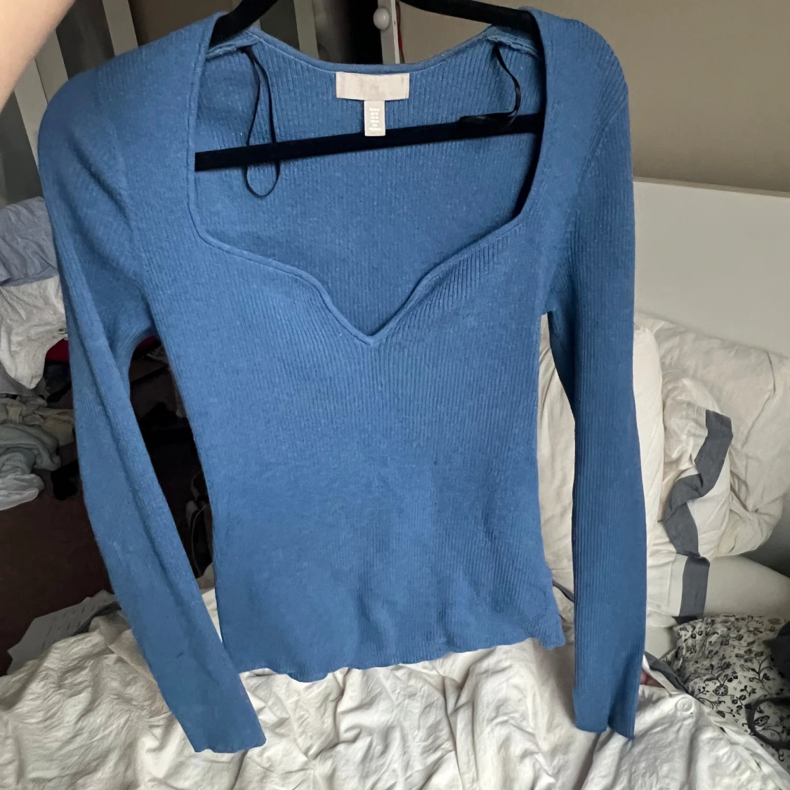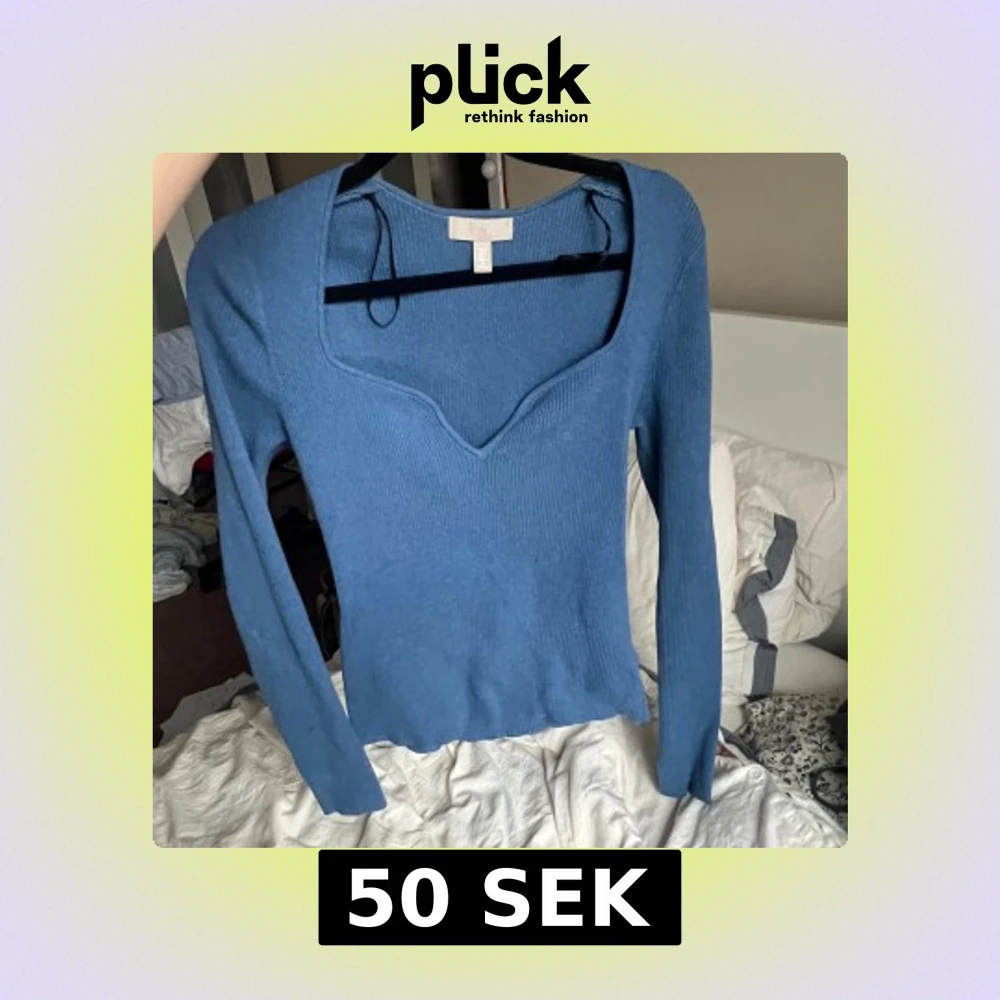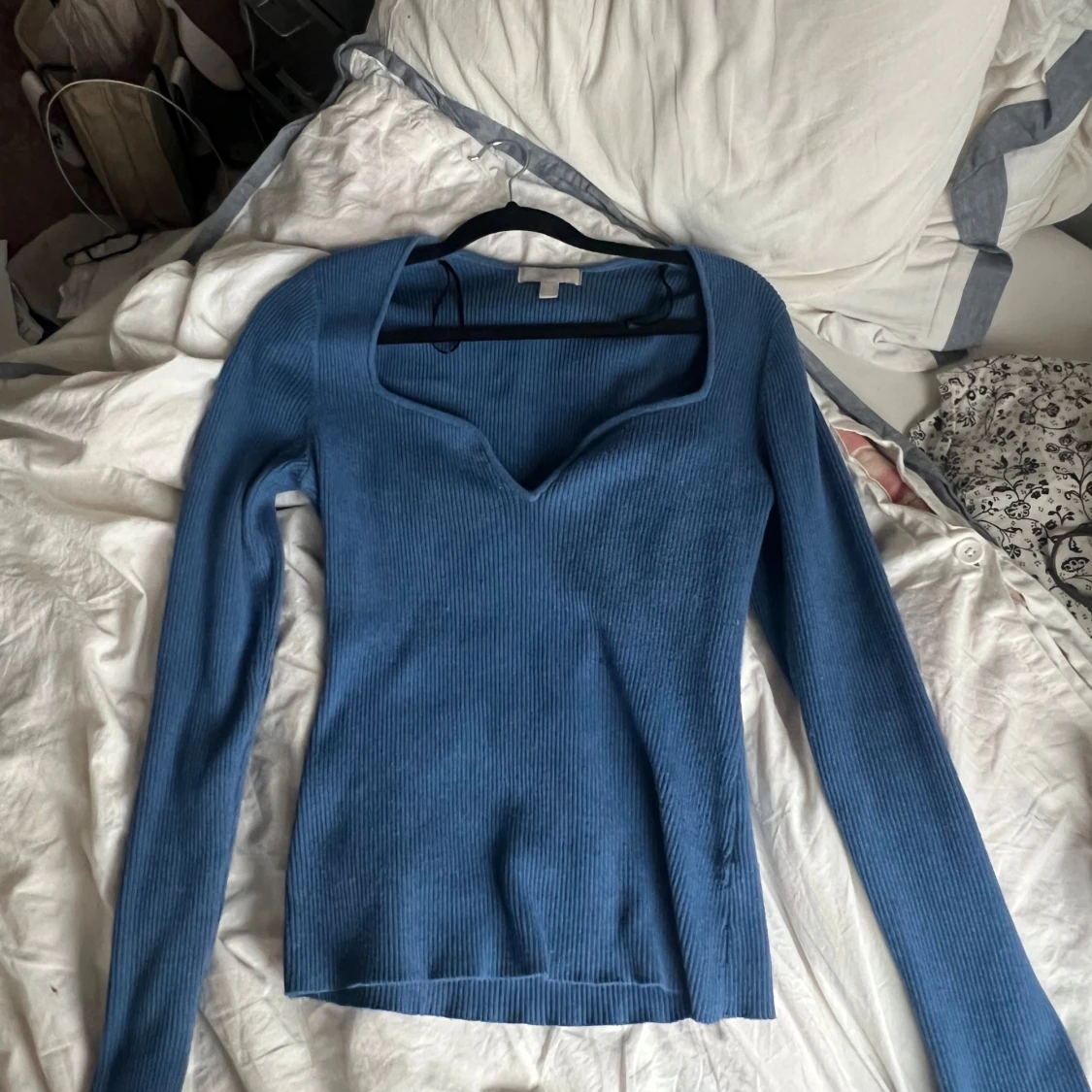 Säljer en blå långärmad tröja med snygg v-ringning och ribbad struktur. Tröjan har en figurnära passform och är perfekt för lager-på-lager. Enkel och stilren design som passar till mycket.