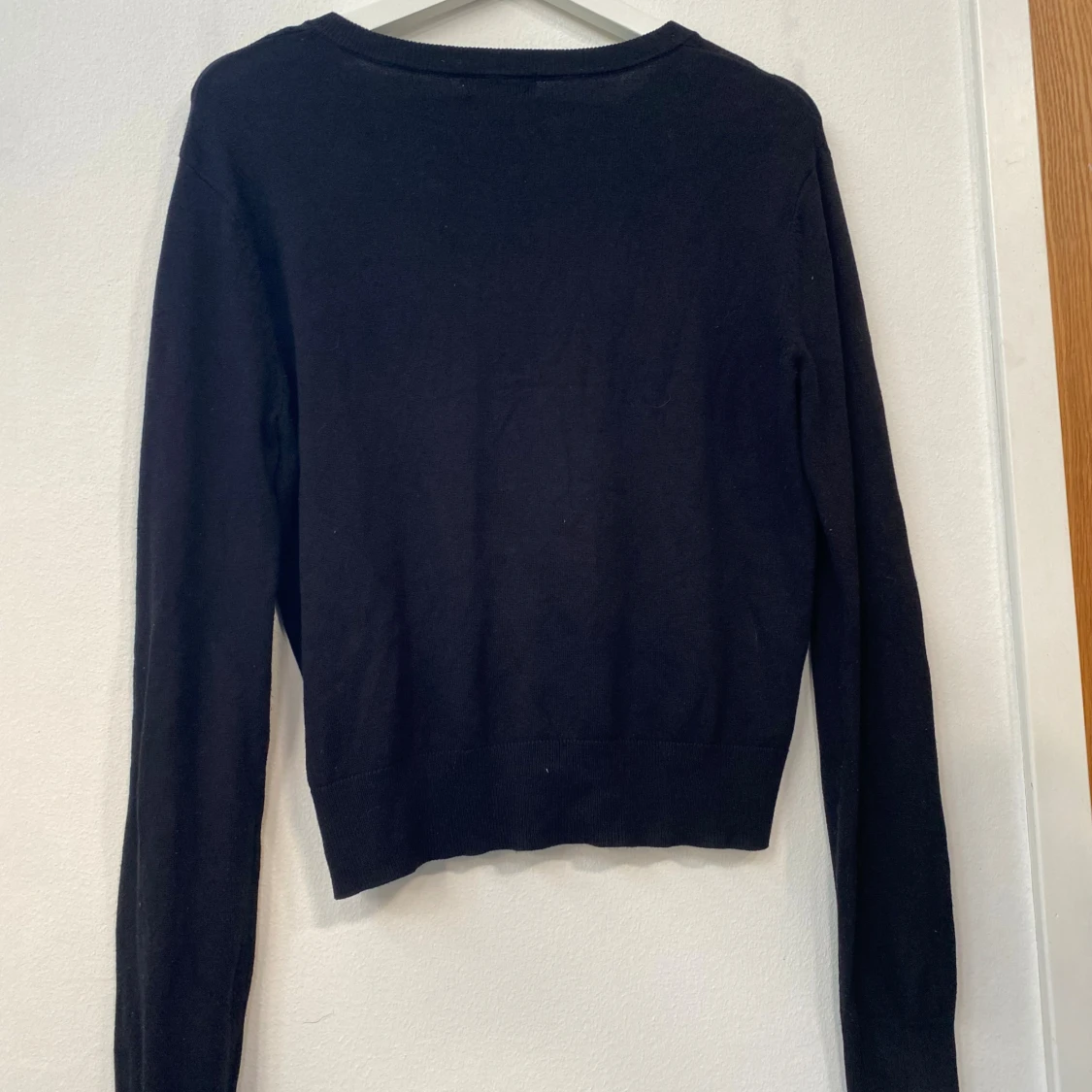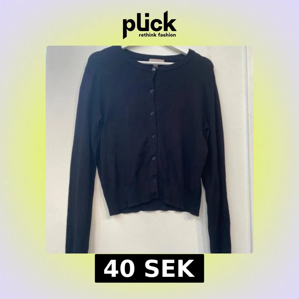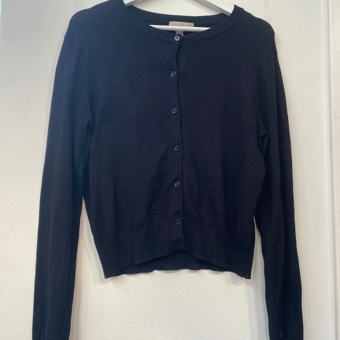 En klassisk svart kofta från H&M i storlek M. Koftan har rund halsringning, långa ärmar och knäppning med svarta knappar framtill.