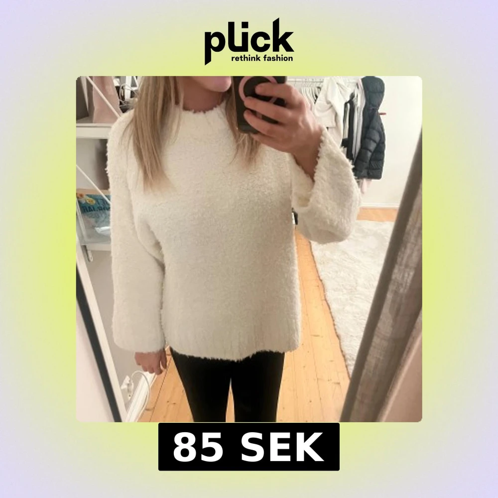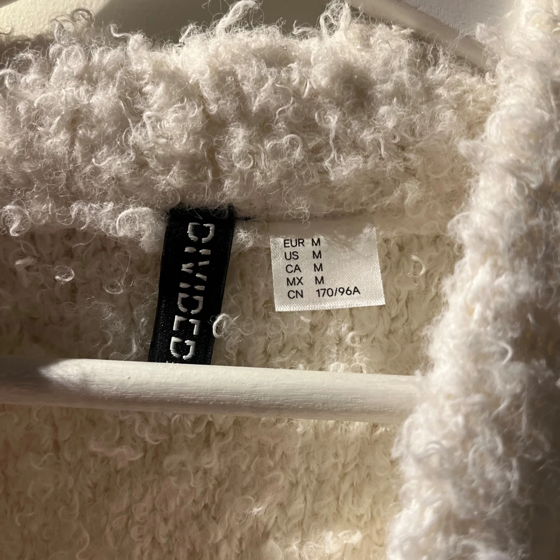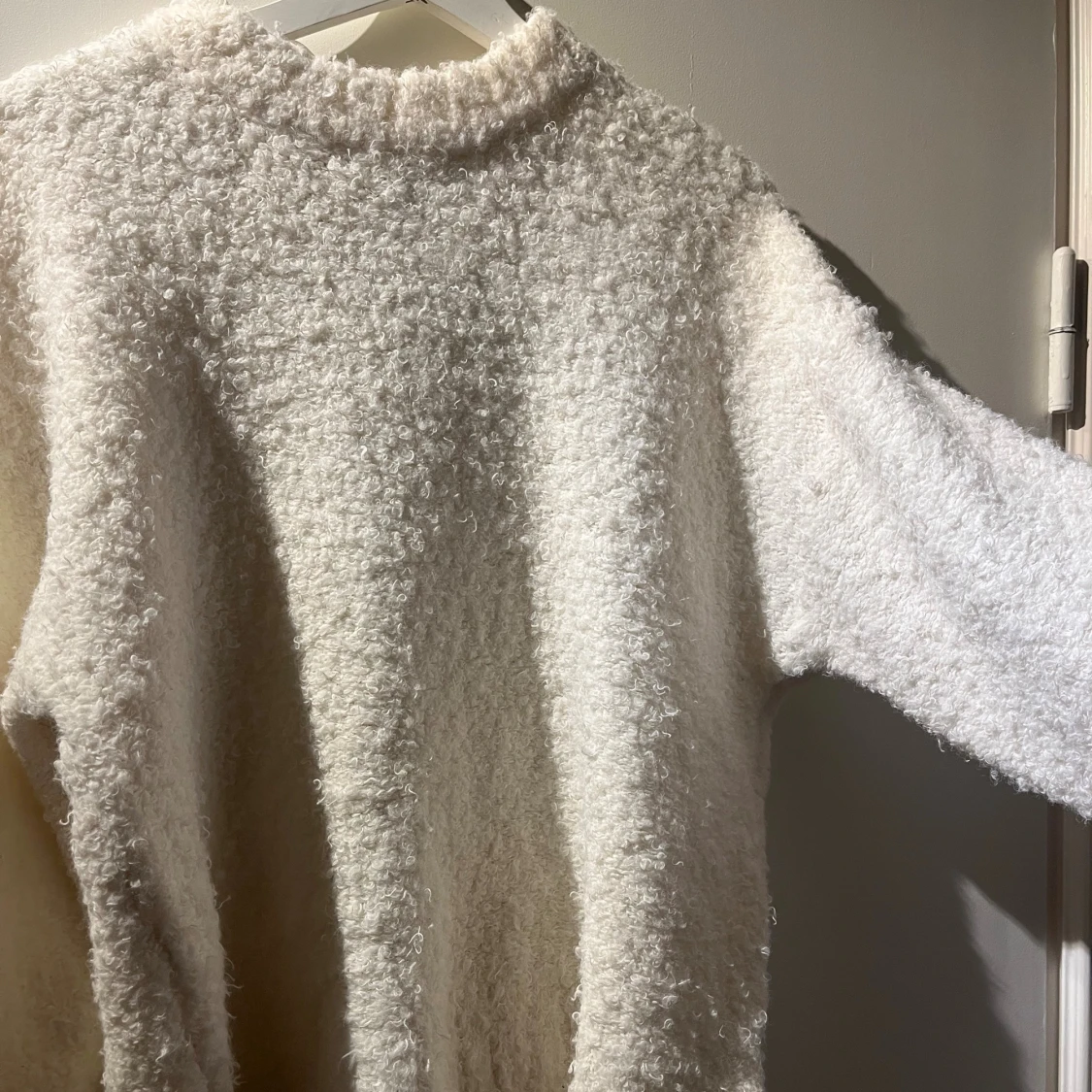 Supermysig vit tröja från Hm i storlek M. Den har en fluffig, stickad yta och en rak, loose passform med långa ärmar och rund hals. Perfekt för att hålla sig varm och se chill ut under höst och vinter.