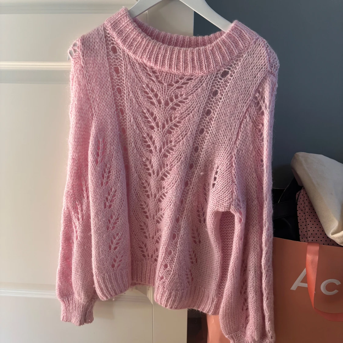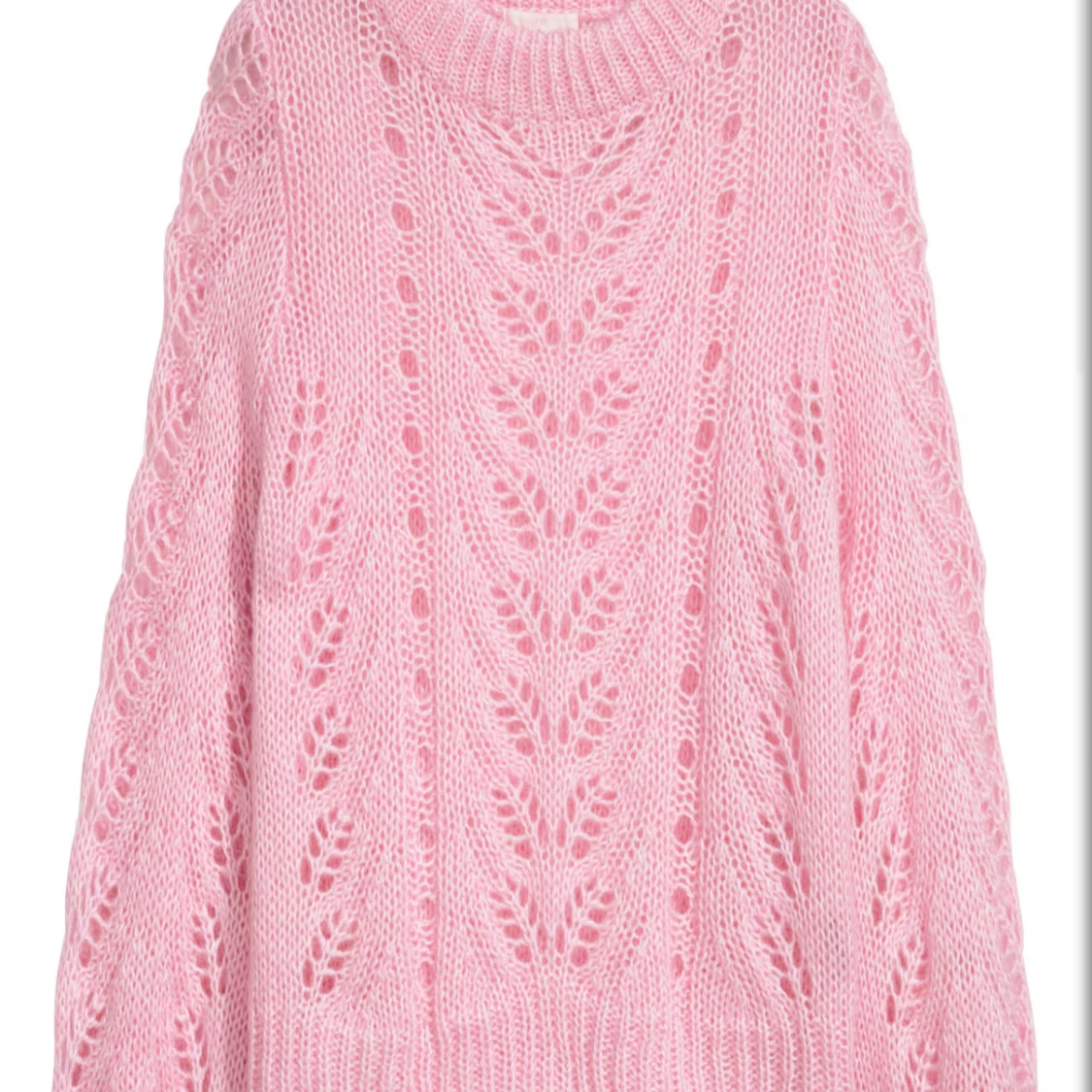 Superfin rosa stickad tröja med hålmönster och bred ribbad krage. Tröjan har långärmade ballongärmar och ett snyggt, luftigt mönster som ger en cool vibe. Perfekt att styla med jeans eller kjol för en chill look 🩷