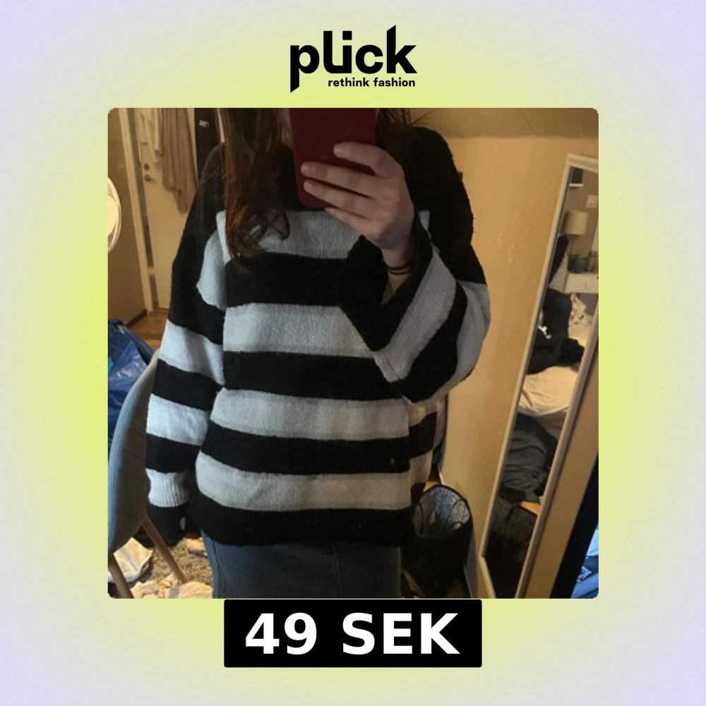 Säljer en oversized stickad tröja med breda svarta och vita ränder. Tröjan har lång ärm och är supermjuk och skön, perfekt för kyliga dagar. Passar dig som gillar en chill och avslappnad stil.