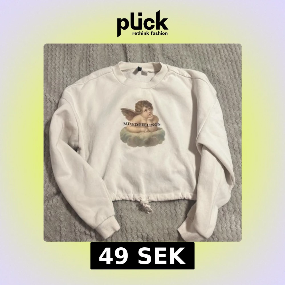 Säljer en beige croppad sweatshirt med ett tryck av en ängel och texten 'Mixed Feelings'. Tröjan har långa ärmar och en justerbar dragsko i nederkanten. Perfekt för en avslappnad stil. Storlek M. Lite använd. 60% Bomull, 40% Polyester