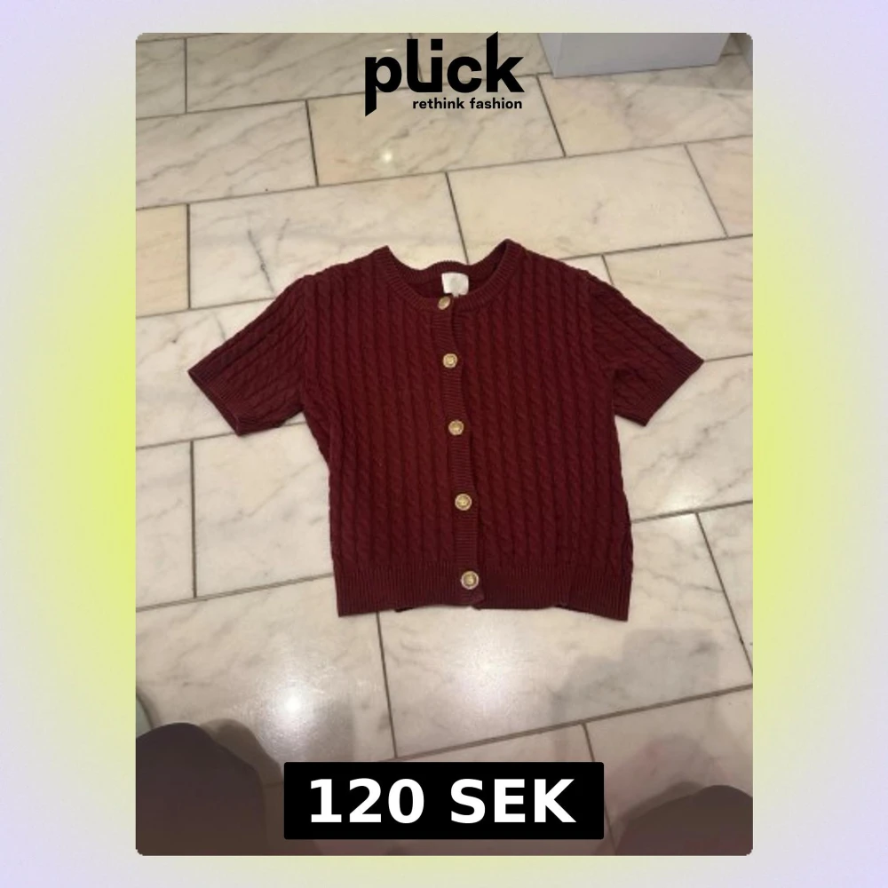 Säljer en vinröd kortärmad kofta med snygg kabelstickad struktur och guldfärgade knappar framtill. Tröjan har rund halsringning och ribbade kanter för en clean look. Perfekt att styla över ett linne eller t-shirt.