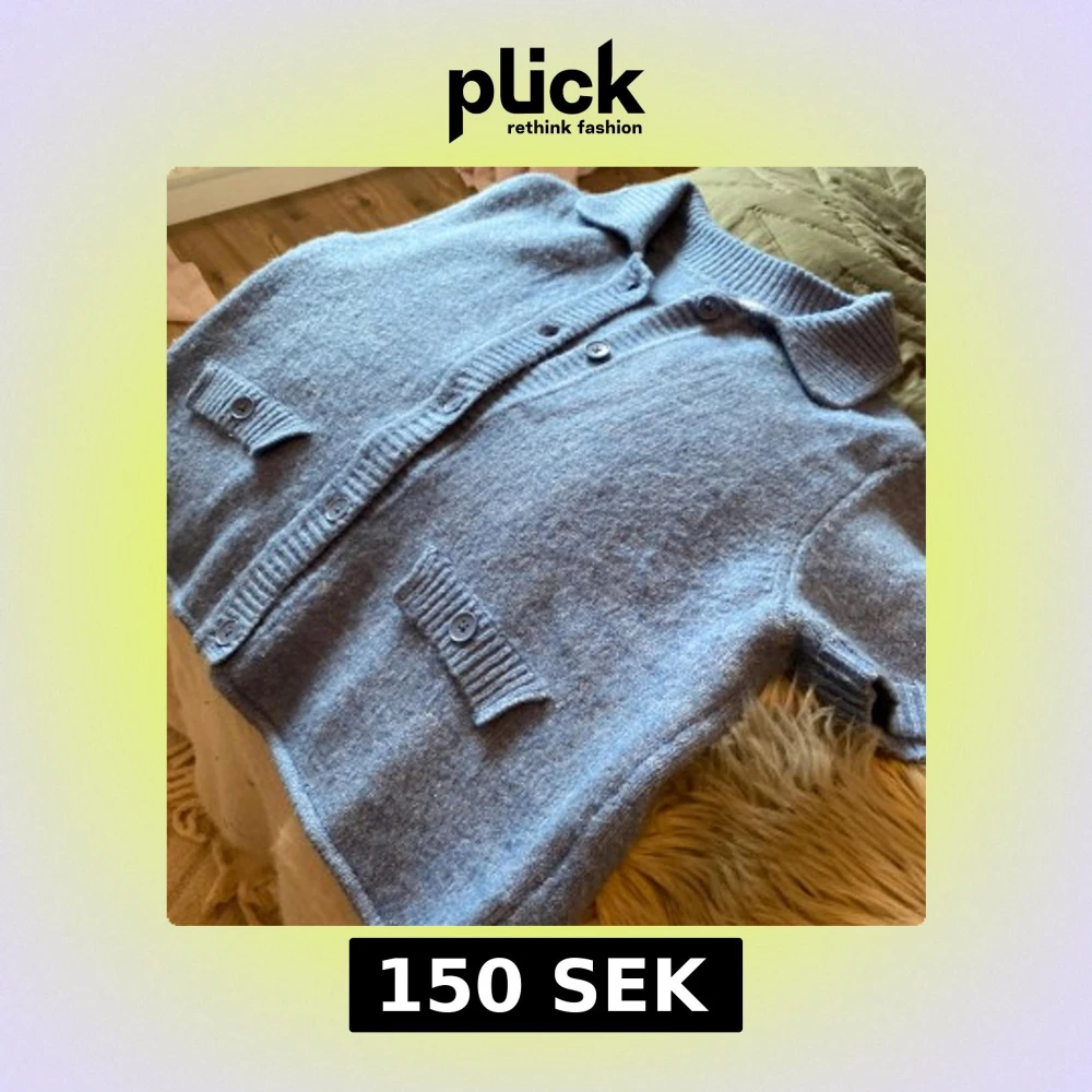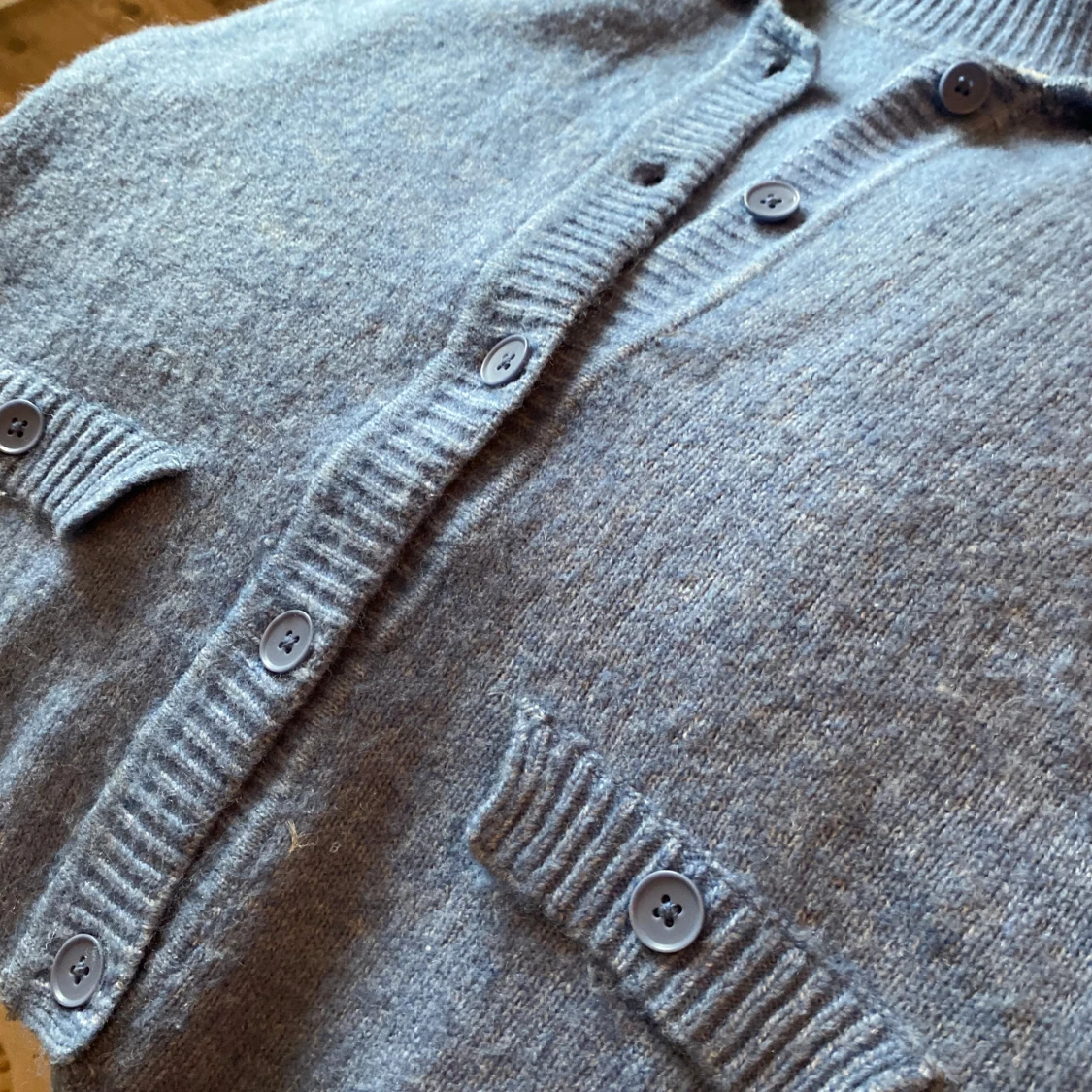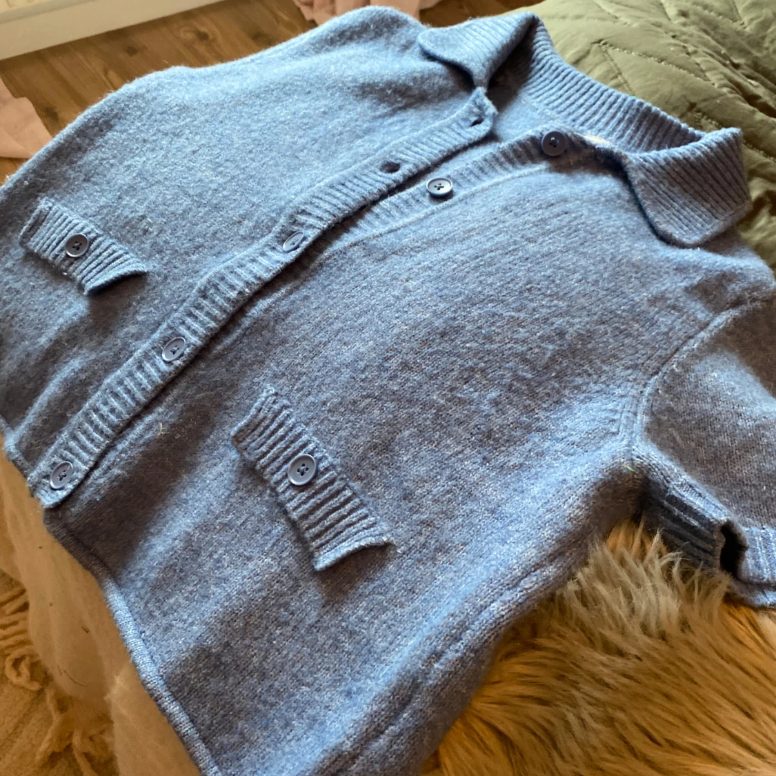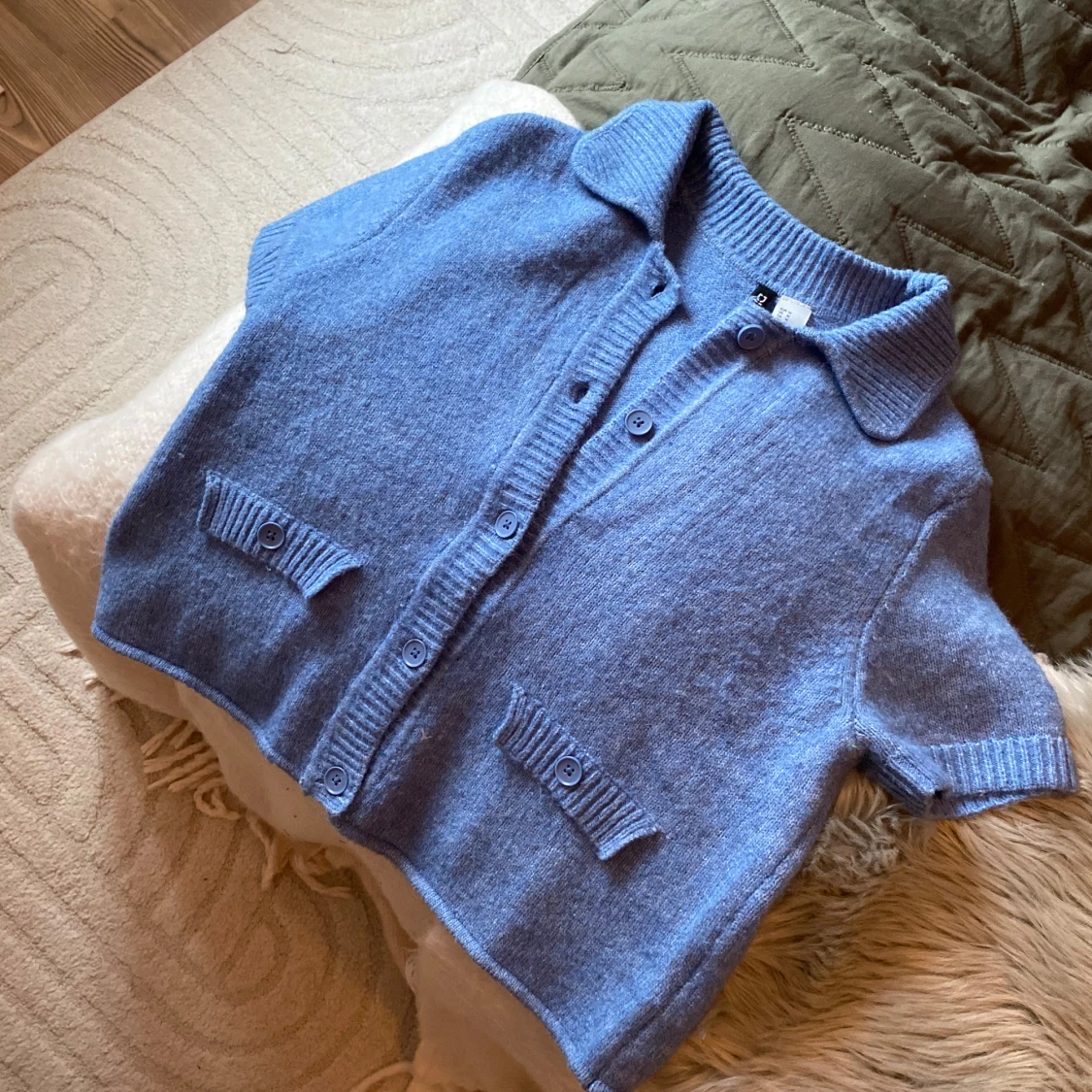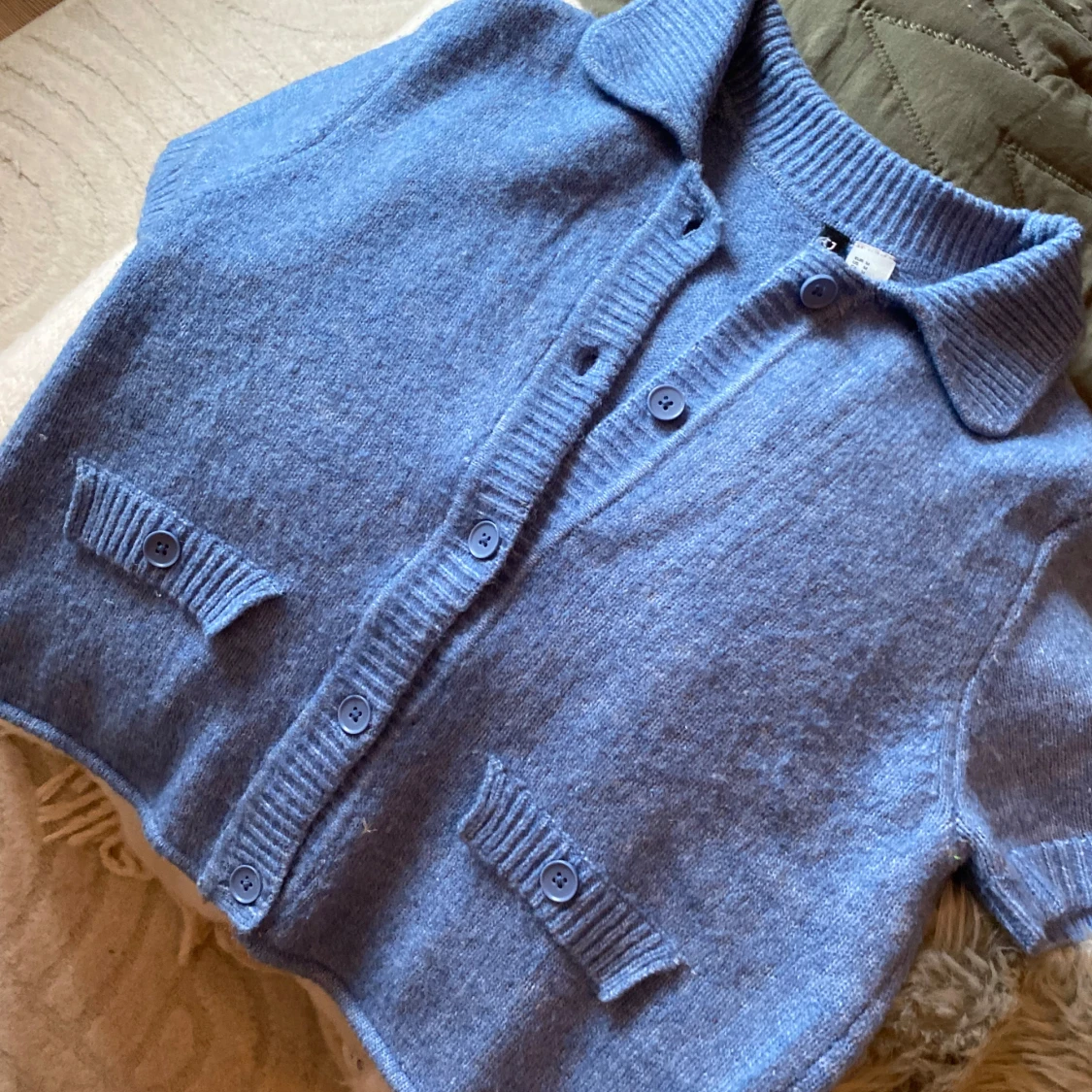 Superfin blå stickad kofta från hm med korta ärmar, krage och knappar hela vägen fram. Två fickor framtill med ribbade detaljer och knappar.