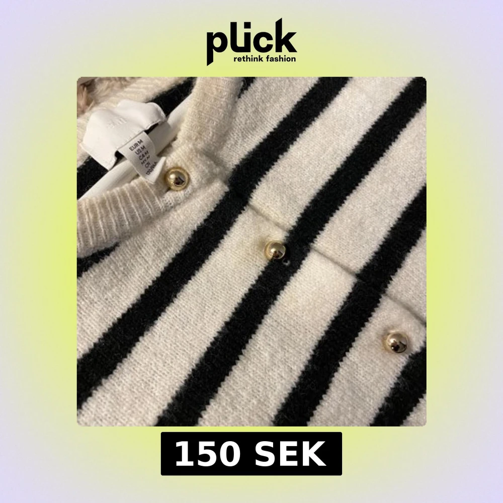 Snygg och stilren kofta med svartvita ränder och korta ärmar. Den har guldfärgade knappar och ett mysigt material