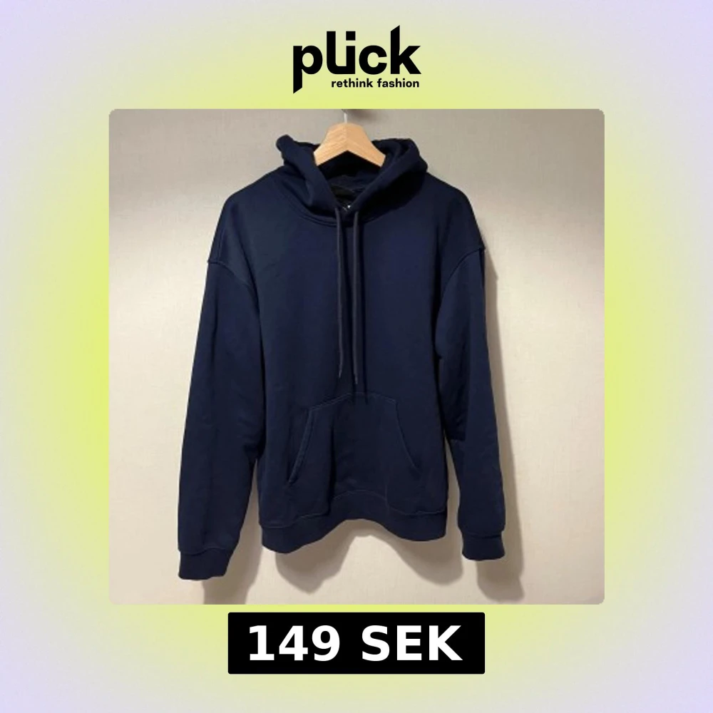 Säljer en stilren mörkblå hoodie med huva och snörning. Tröjan har en stor magficka och långa ärmar med ribbade muddar. Perfekt för dig som gillar enkel och avslappnad stil. Passformen är normal och materialet känns mjukt och bekvämt.