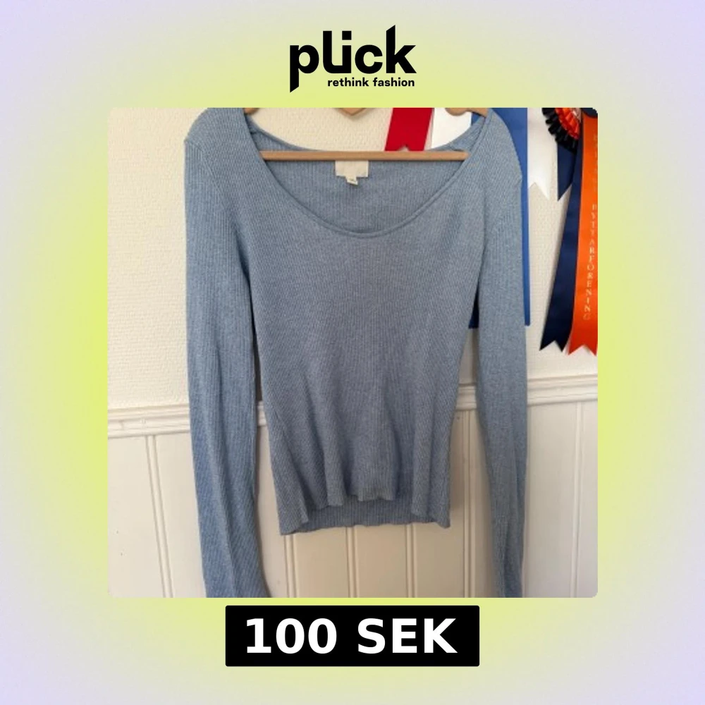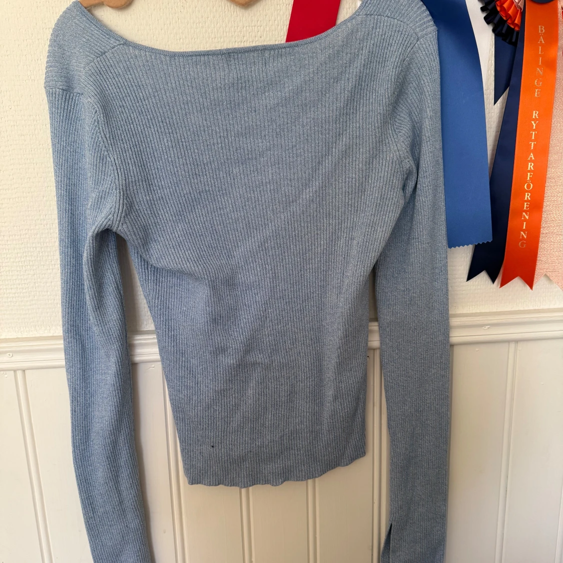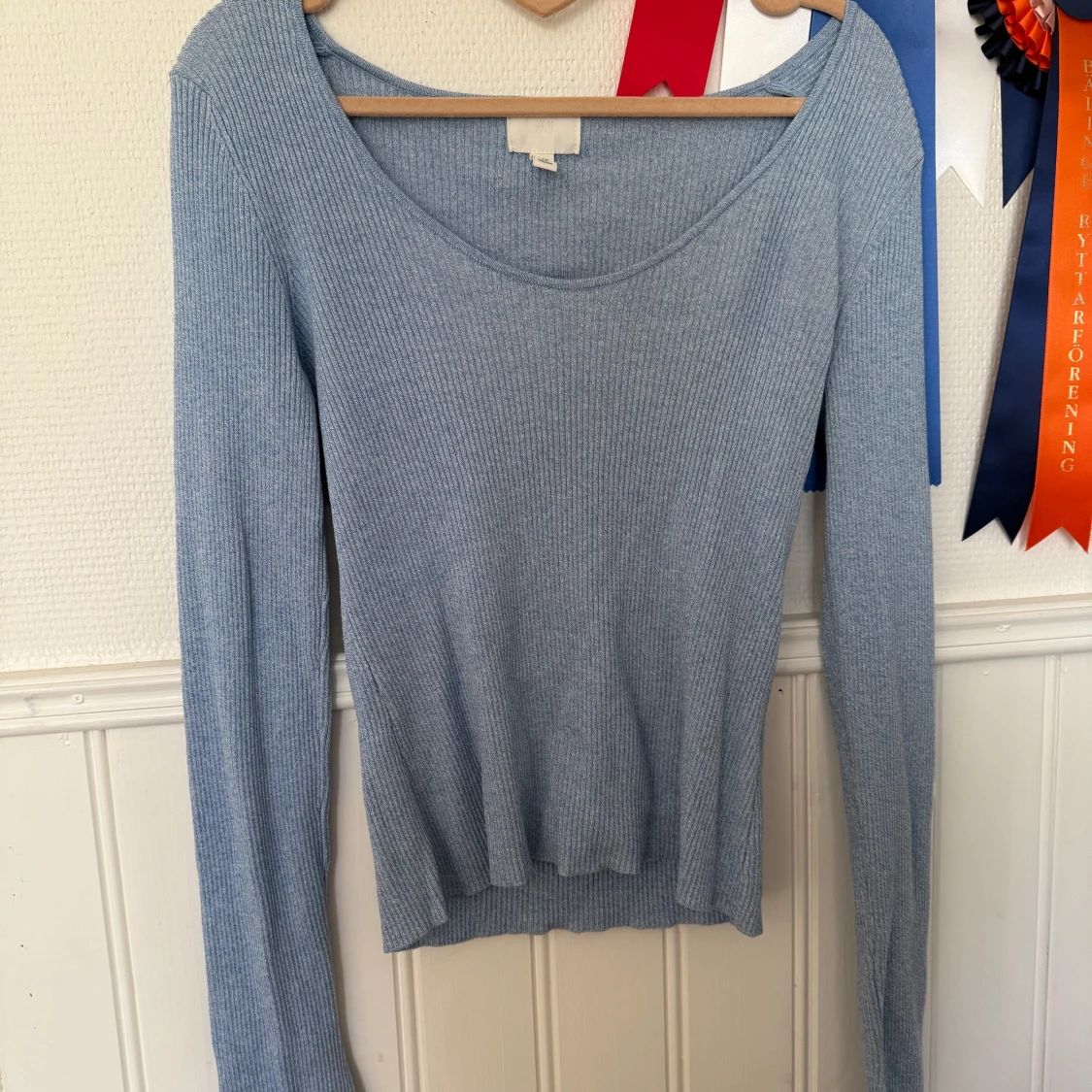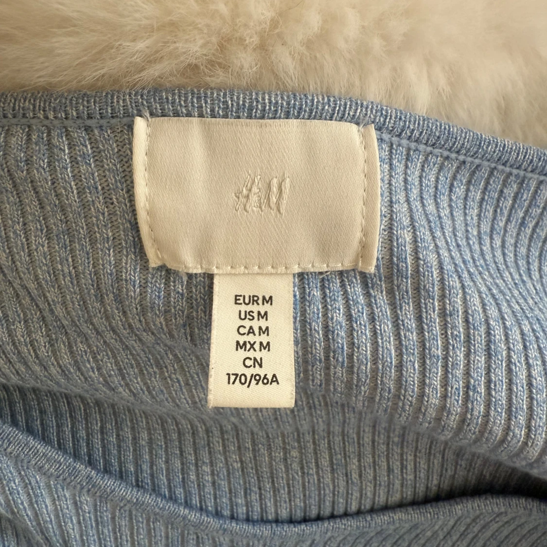 Superfin ljusblå ribbad tröja från H&M med rundad halsringning och långa ärmar. Tröjan är figurnära och har en mjuk, stretchig känsla som passar perfekt till jeans eller kjol. Enkel och stilren design som är lätt att matcha.