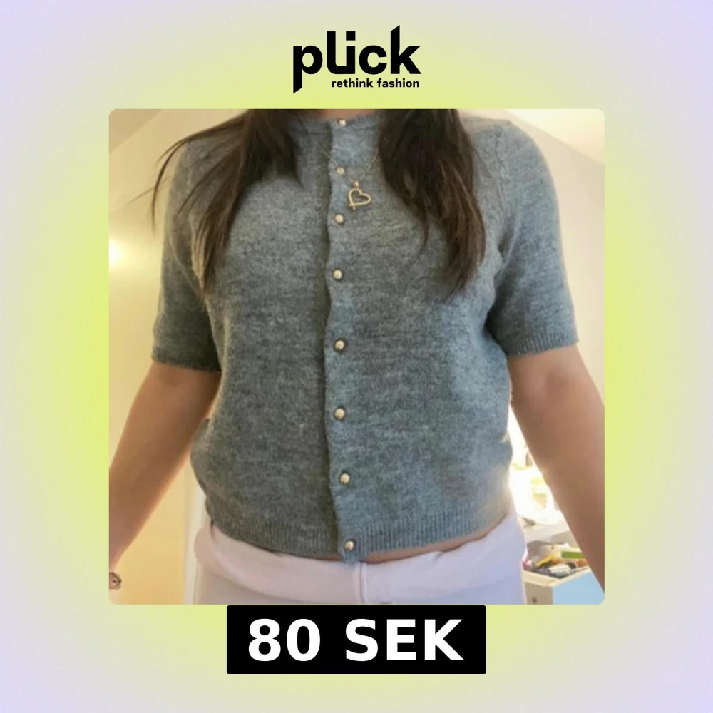 Mysig grå stickad kofta från H&M med korta ärmar och snygga guldiga knappar framtill. Perfekt att slänga på sig över ett linne eller t-shirt.