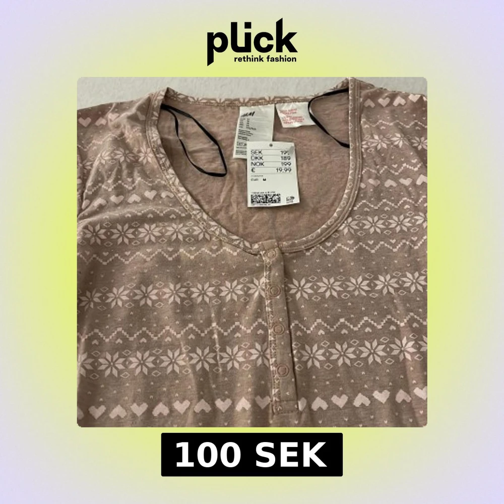 Supersöt beige långärmad tröja från H&M med ljusa vintermönster av snöflingor och hjärtan. Rund halsringning och knappdetaljer framtill. Perfekt för mysiga dagar och vintersäsongen.