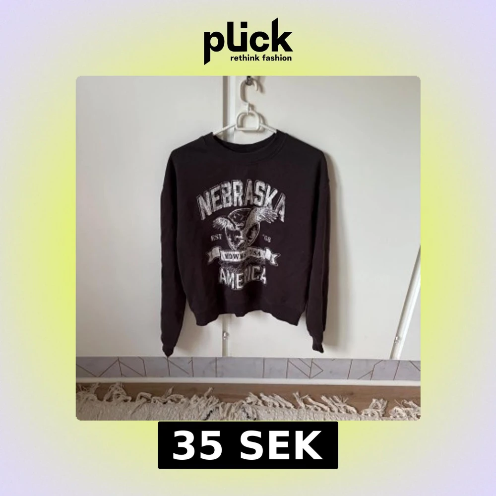 Cool grå sweatshirt från H&M Divided med tryck i vitt framtill: 'Nebraska America' och en örn. Tröjan har rund hals, ribbade muddar och är långärmad. Perfekt för dig som gillar college-stil och vill ha en avslappnad look.