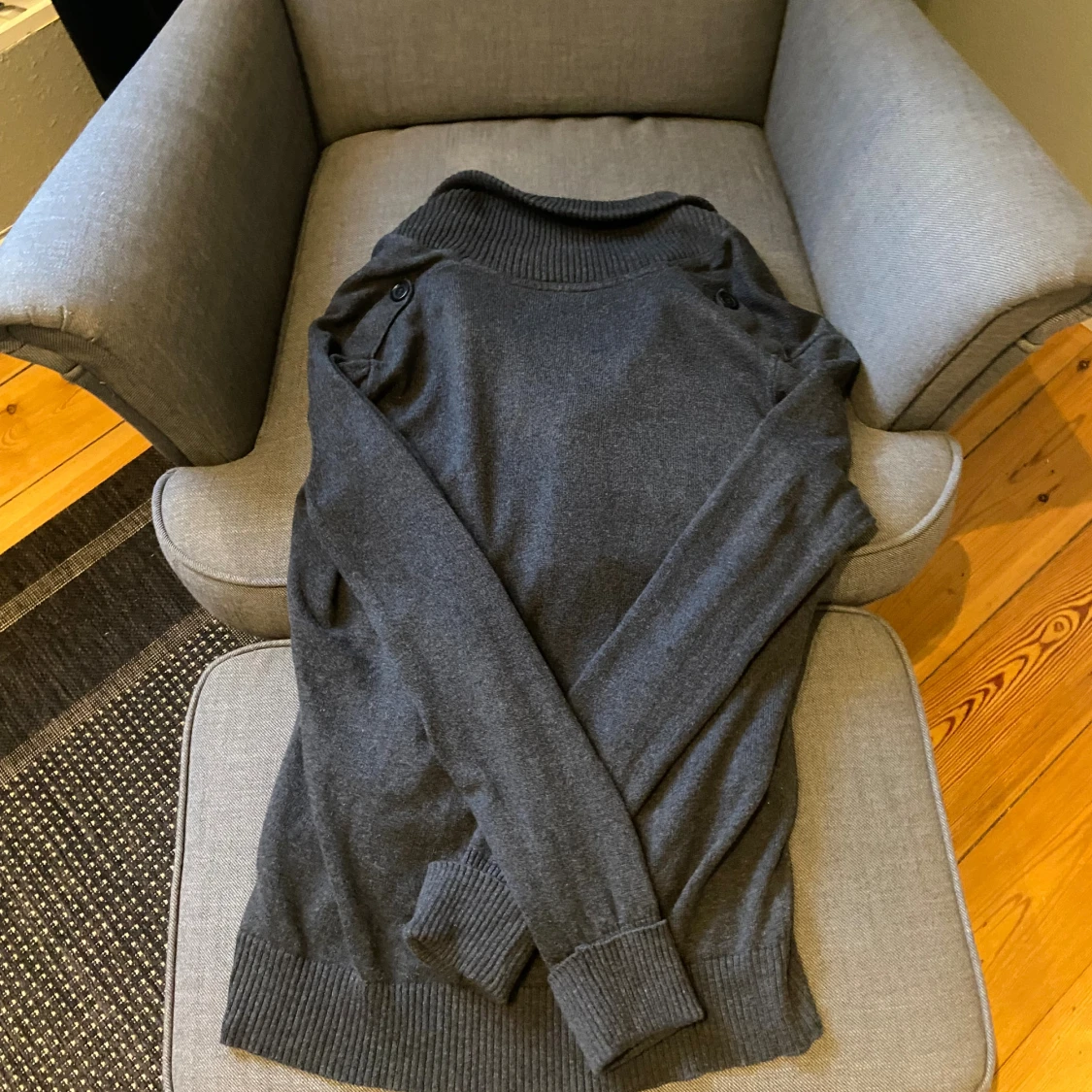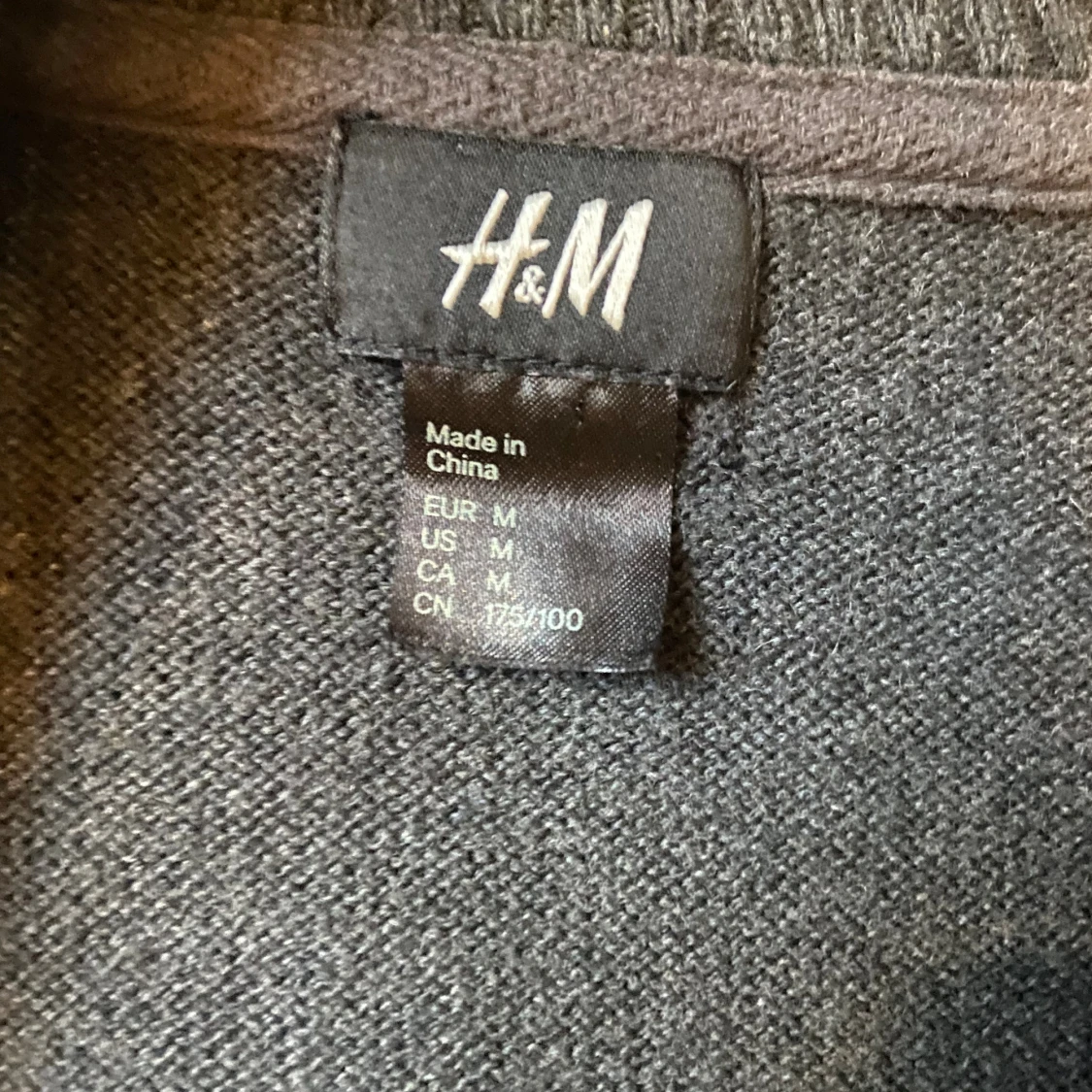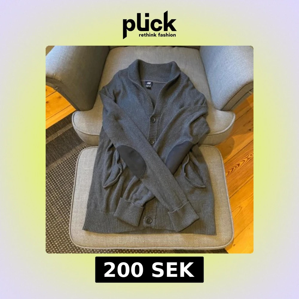 Mysig mörkgrå kofta från H&M med bred ribbad krage, knäppning framtill och förstärkta armbågslappar. Koftan har två fickor och ribbade muddar vid ärmslut och nederkant. Perfekt för lager-på-lager under kyliga dagar.