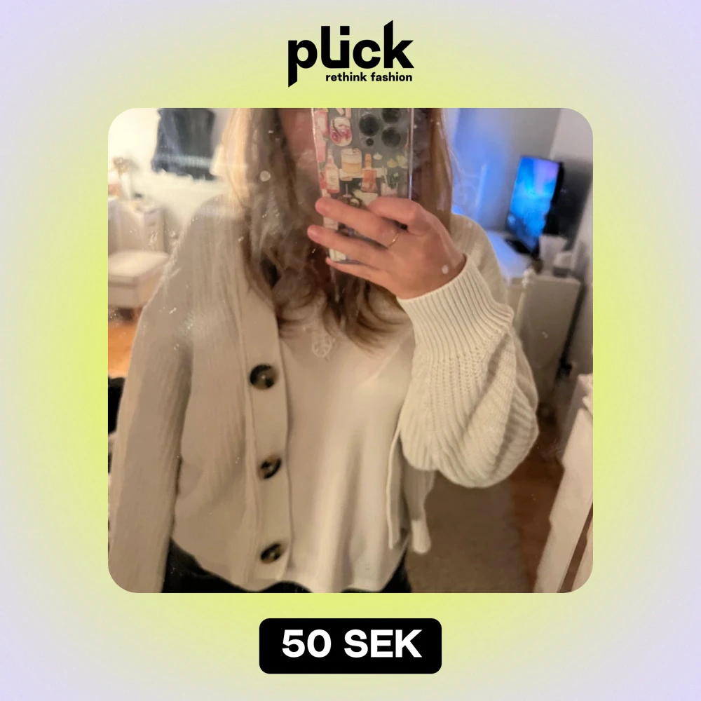 Säljer en supermysig vit stickad kofta med stora svarta knappar. Perfekt för kyliga dagar och passar till allt! Koftan har långa ärmar och en skön, lös passform. Den är i bra skick och redo för en ny ägare. Perfekt för höst och vinter!