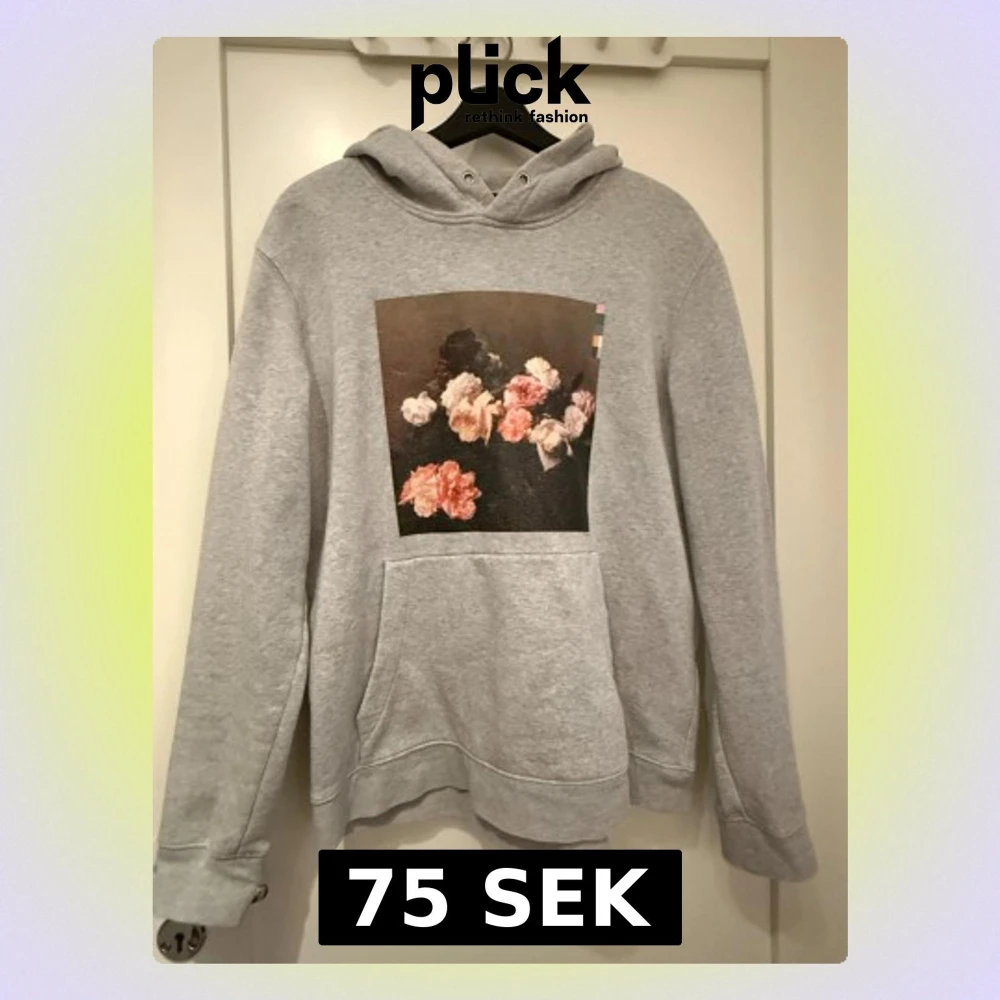 Säljer en grå hoodie i storlek M med ett stort blommigt tryck på bröstet i rosa och beige toner. Tröjan har huva med snörning och en klassisk magficka. Perfekt för dig som gillar konstnärliga detaljer och chill stil.