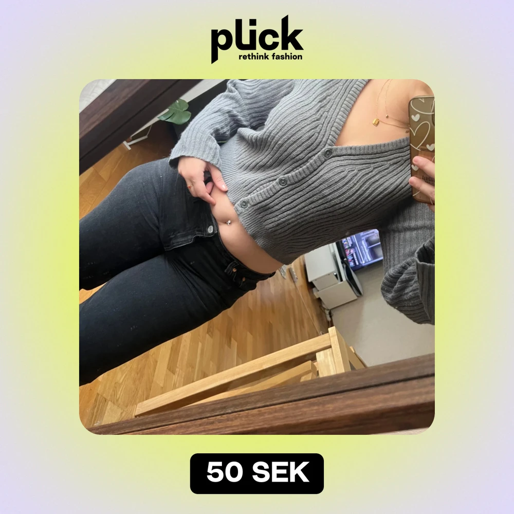Säljer en superfin grå ribbad kofta med v-ringning och knappar framtill. Den är croppad och har långa ärmar, perfekt för både höst och vår. Från HM