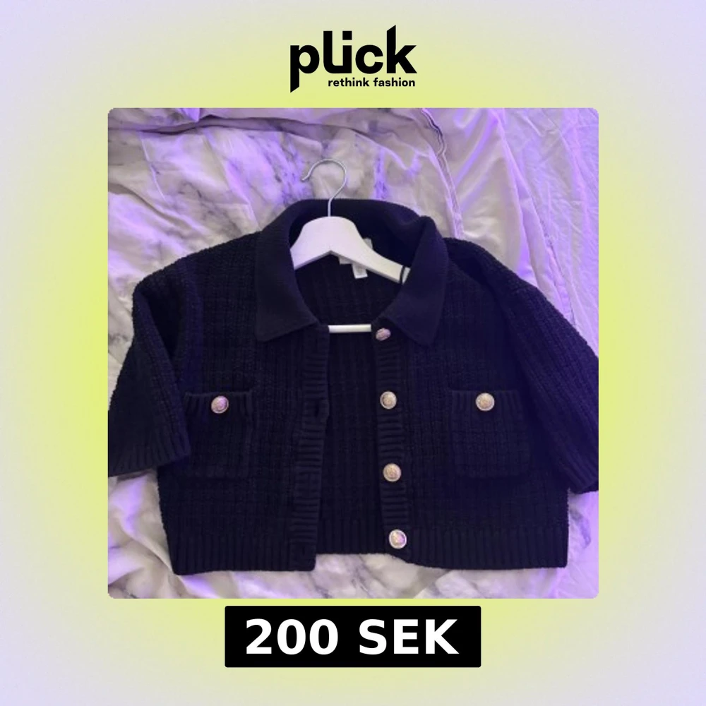 Snygg svart stickad kofta från H&M med croppad passform, stora guldiga knappar och två fickor framtill. Koftan har krage och ribbade detaljer vid ärmslut och nederkant. Perfekt för lager-på-lager och ger en chic vibe till din outfit.
