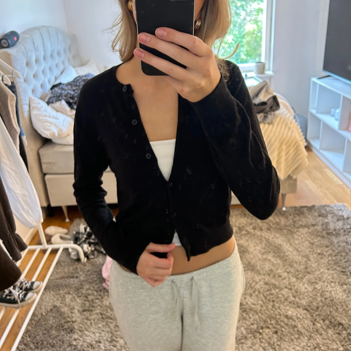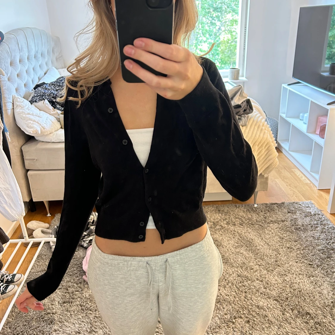 En svart, klassisk kofta med knappar framtill. Modellen är croppad och har lång ärm. Perfekt att slänga över ett linne eller t-shirt för en chill och stilren look. Enkel och tidlös design som passar till det mesta.