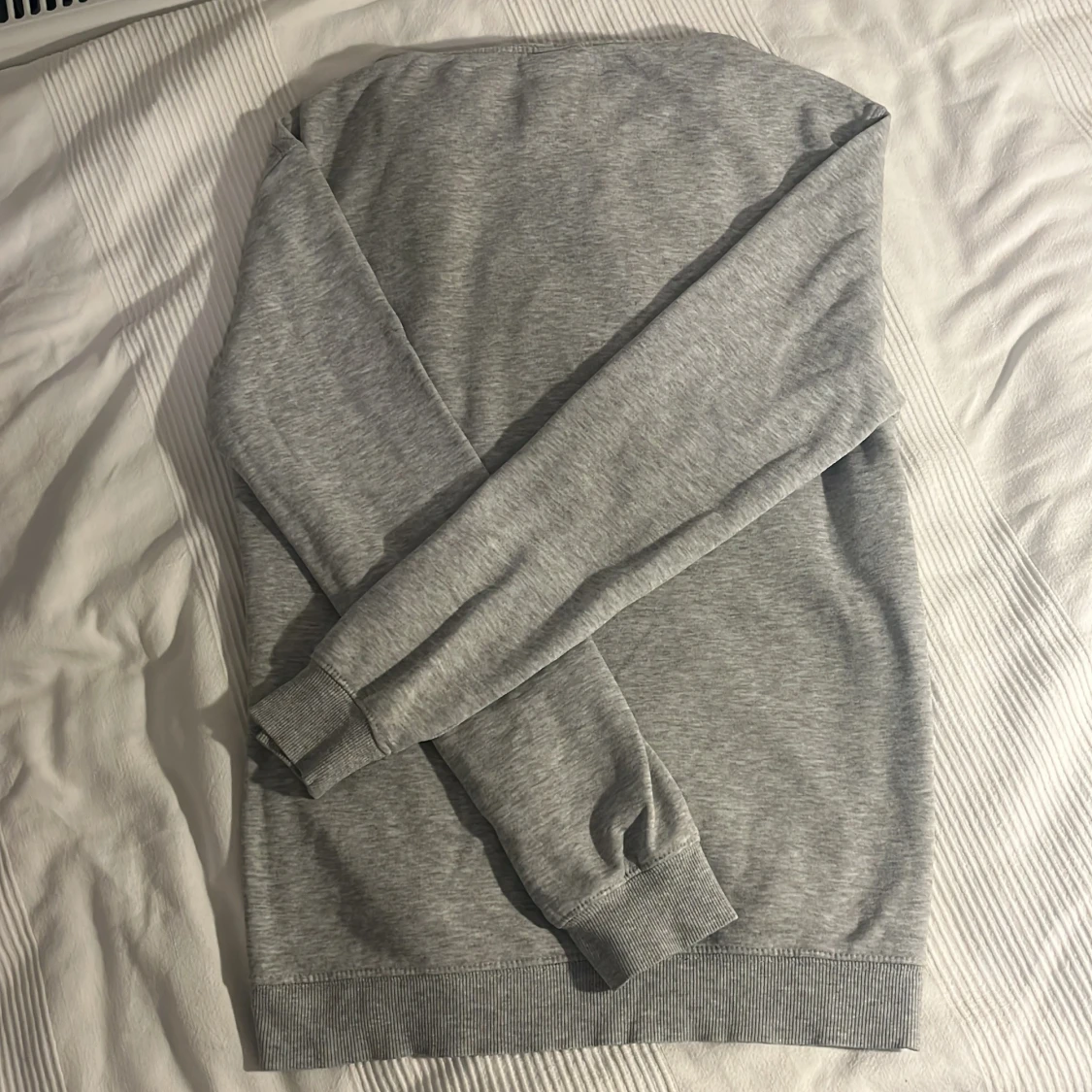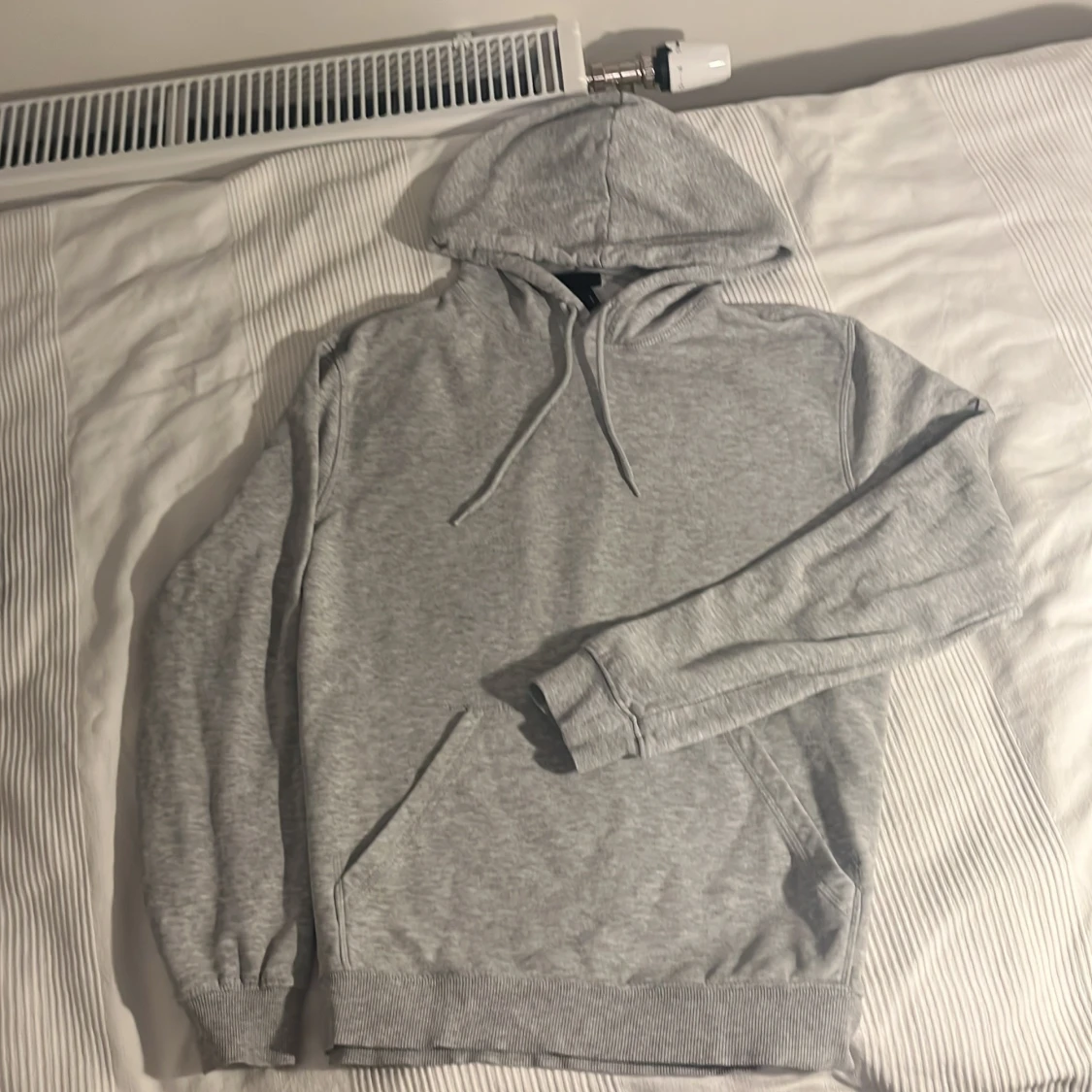 En stilren grå hoodie från H&M i storlek M. Tröjan har huva med snörning, känguruficka framtill och ribbade muddar vid ärmslut och nederkant. Perfekt för chill dagar eller när du vill ha en enkel och clean look.