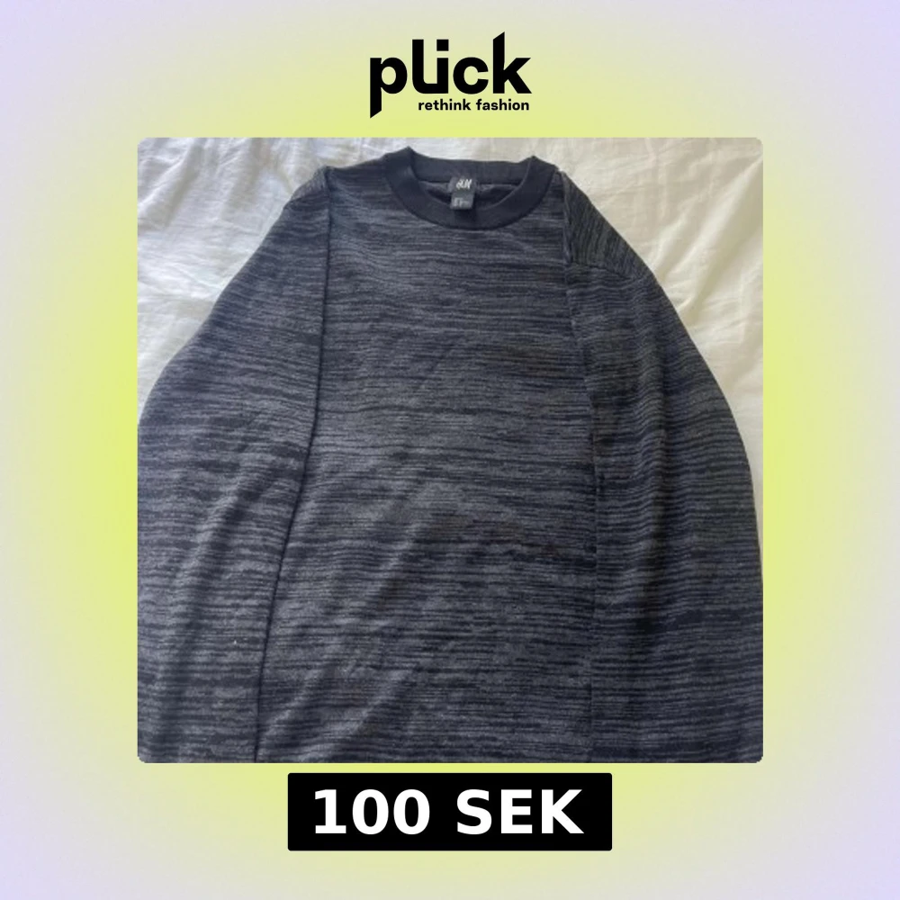 Säljer en mörkgrå tröja från H&M i storlek M. Tröjan har ett diskret randigt mönster, rund halsringning och långa ärmar. Perfekt för dig som gillar en enkel men stilren look. Materialet känns mjukt och bekvämt mot huden.